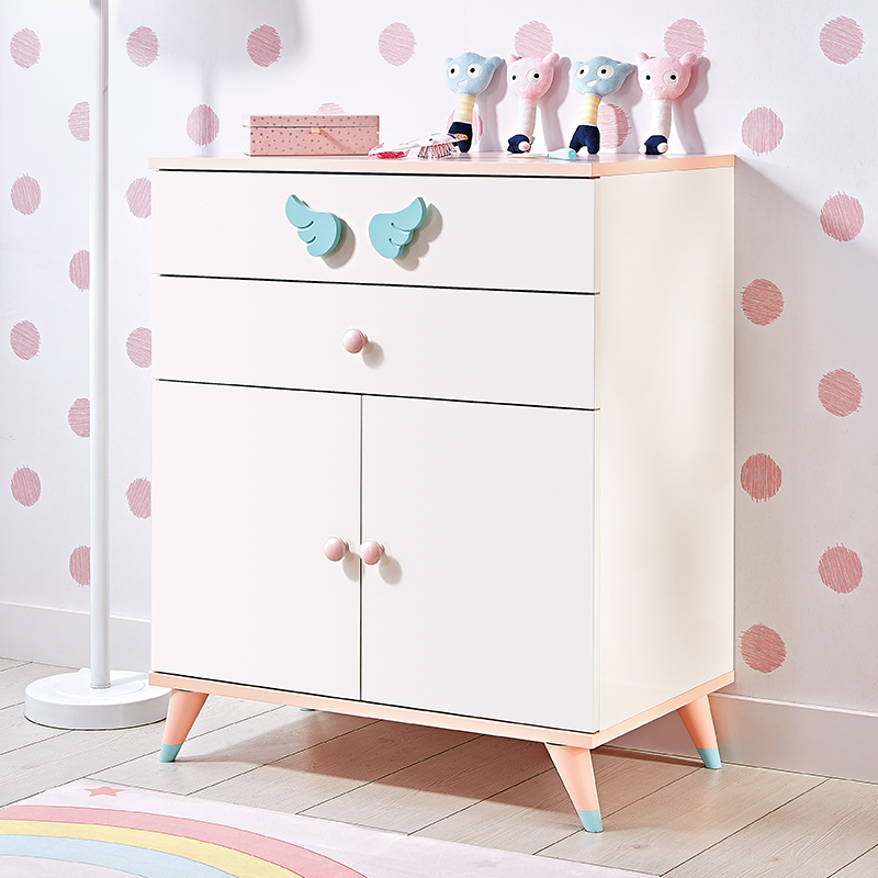 Създадено със съвършен баланс между функционалност и дизайн, това детско шкафче е истинско бижу за всяка детска стая. С крилца на дръжките, този шкаф приковава вниманието с нежния си и игрив стил. Изработен от висококачествени материали, той предлага устойчивост и дълготрайност, което е от съществено значение за активните малчугани.