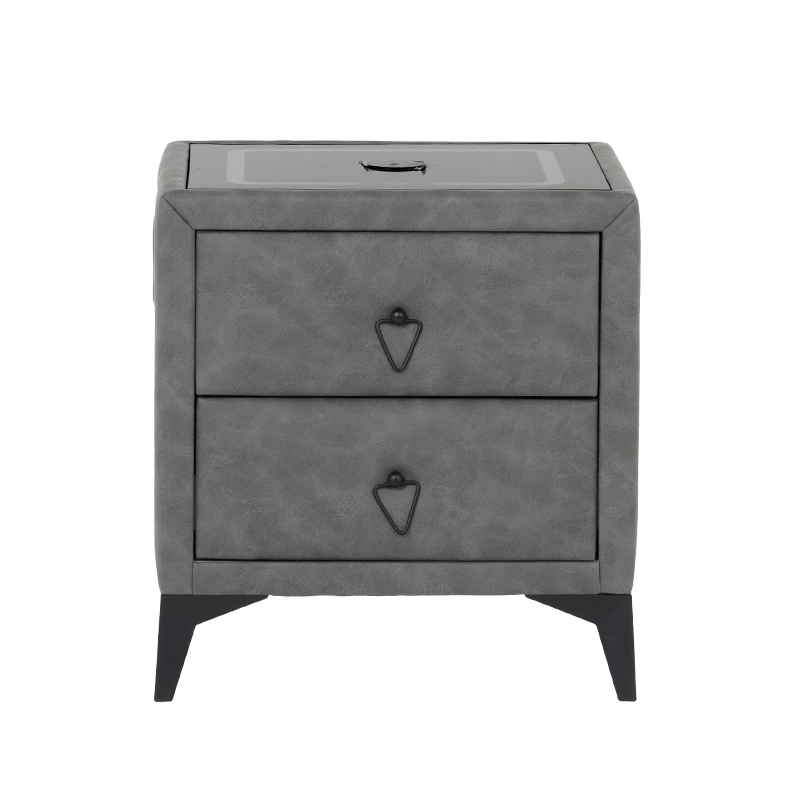 Това е елегантно нощно шкафче, което съчетава модерен дизайн с функционалност. Облечено в изискан сив тон, то излъчва спокойствие и стил, което лесно се вписва във всяка спалня. Шкафчето е изработено от материали с високо качество, осигуряващи здравина и устойчивост.