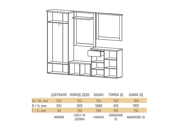 – Шкаф Lora 2Д1Ш: 93 см ширина / 39 см дълбочина / 91 см височина