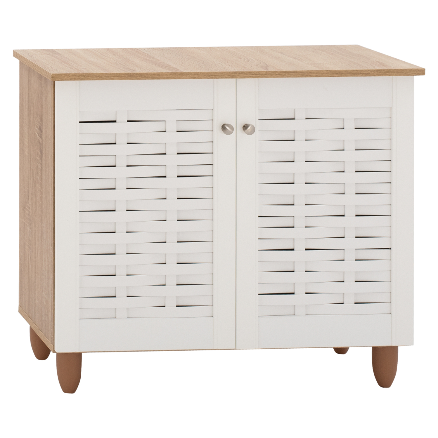 Цветовата комбинация от елегантно бяло и топъл дървесен нюанс добавя свежест и уют на всяко пространство. Вратите са изработени в ефектен решетъчен дизайн, който добавя допълнително визуален интерес и разнообразява визията на помещението.