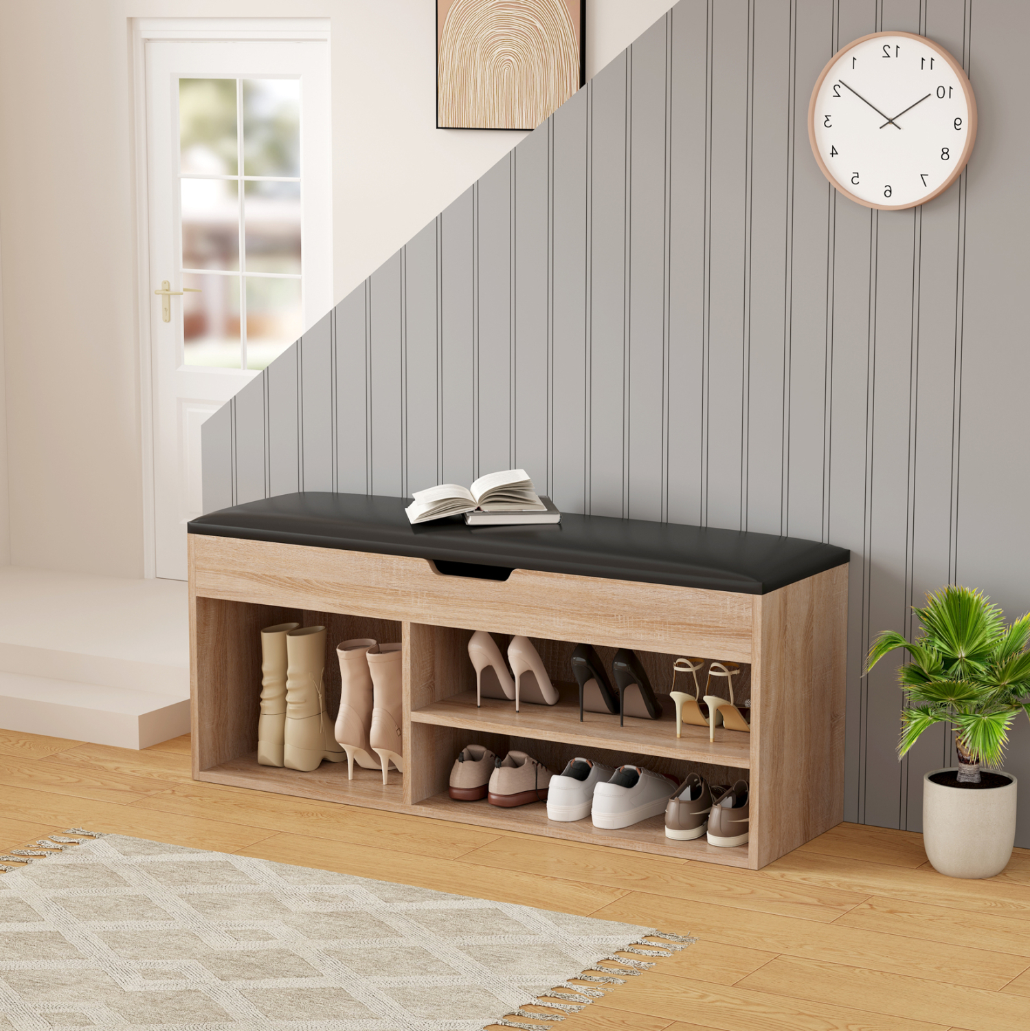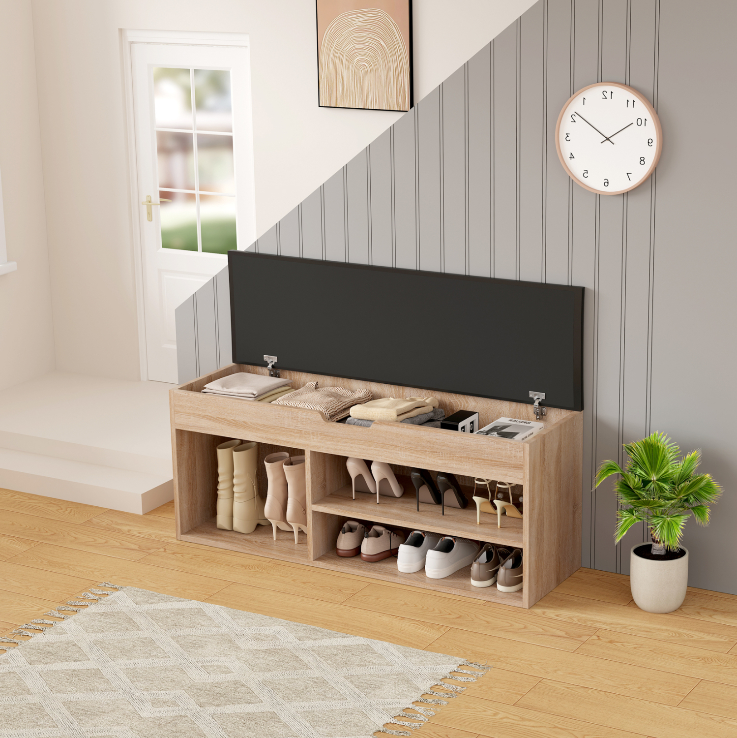 Горният панел е тапициран, осигурявайки удобство и мекота при сядане. Това го прави перфектен за входно антре, където може да се използва ежедневно от цялото семейство. Използваните материали са внимателно подбрани, за да осигурят здравина и дълготрайност, поддържайки отличното състояние на продукта с години.