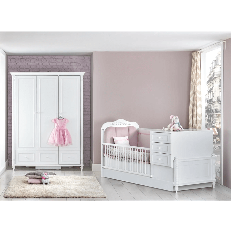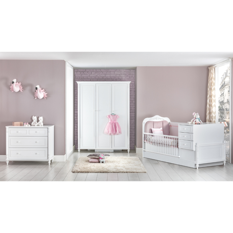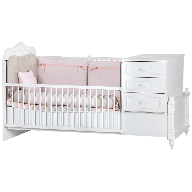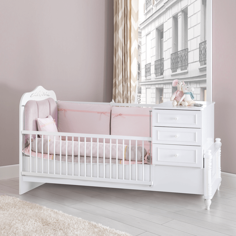 Тази многофункционална мебел включва и практични чекмеджета за съхранение, където можете да подредите дрехи, играчки и други необходими аксесоари. Удобното легло се трансформира от кошара в детско легло с лесни настройки, следвайки растежа на вашето дете.