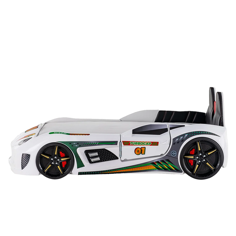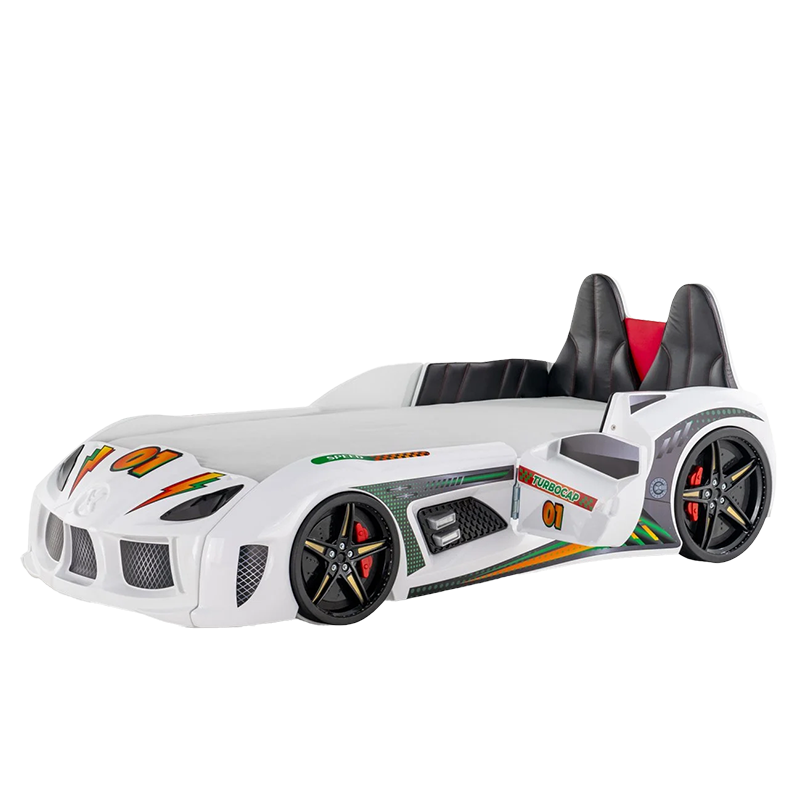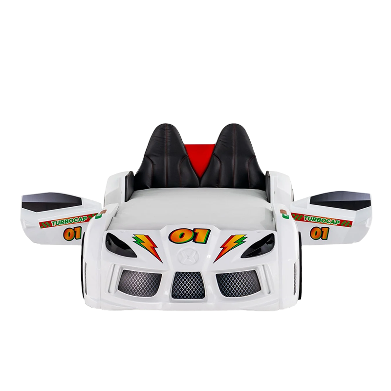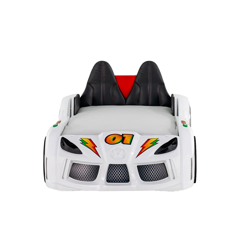 Детско легло 90 – бяло;впечатлява със съвършен баланс между спортна визия и елегантен, неутрален стил. Подходящо за истински малки почитатели на автомобилите, то предлага не само ефектен външен вид, но и множество функционални екстри. Изработено е от висококачествени материали, които гарантират здравина и безопасност. Моделът е оборудван с вградени светлини в колелата, а фаровете могат да се използват и като нощна лампа. Има 4 звукови ефекта, които се управляват с дистанционно, а електронните функции работят с 12V / 2A адаптер. Уникалните акценти включват тапицирана кожена облегалка на седалката и отварящи се врати ; за още по-реалистично автомобилно изживяване. Стабилната конструкция издържа до кг натоварване, а заоблените ръбове осигуряват максимална безопасност по време на сън и игра. Подматрачната рамка е включена в цената. Пълна информация за размерите и характеристиките на модела ще намерите в таблицата в таб/поле „Техническа информация“.