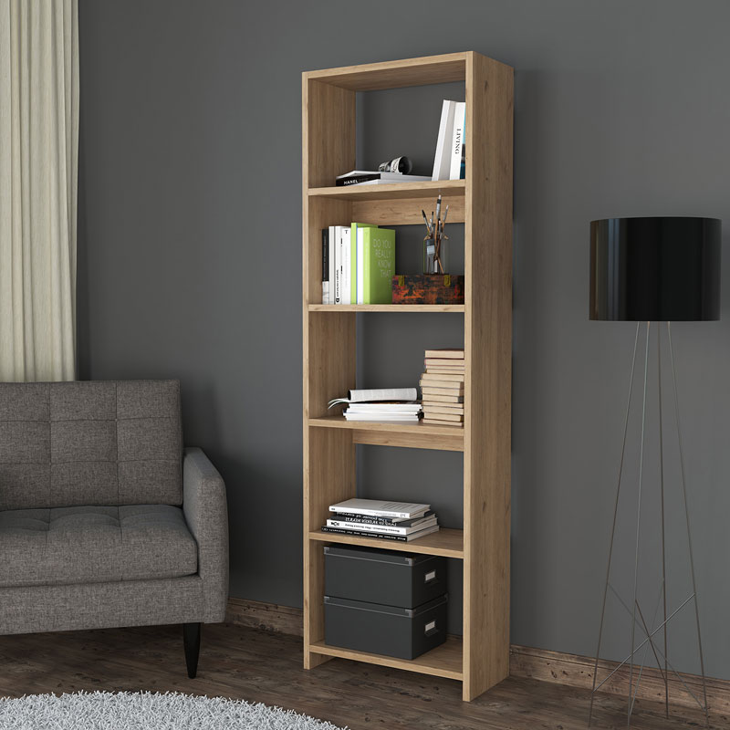 С пет просторни рафта, тази библиотека предоставя достатъчно място за организиране на всякакви предмети – от литературни произведения до модерни аксесоари за дома. Изработена от висококачествени материали, тя е едновременно здрава и устойчива, за да издържи на ежедневната употреба и да запази първоначалния си вид. Естественият й завършек придава топлина и създава уютна атмосфера във всяко помещение.