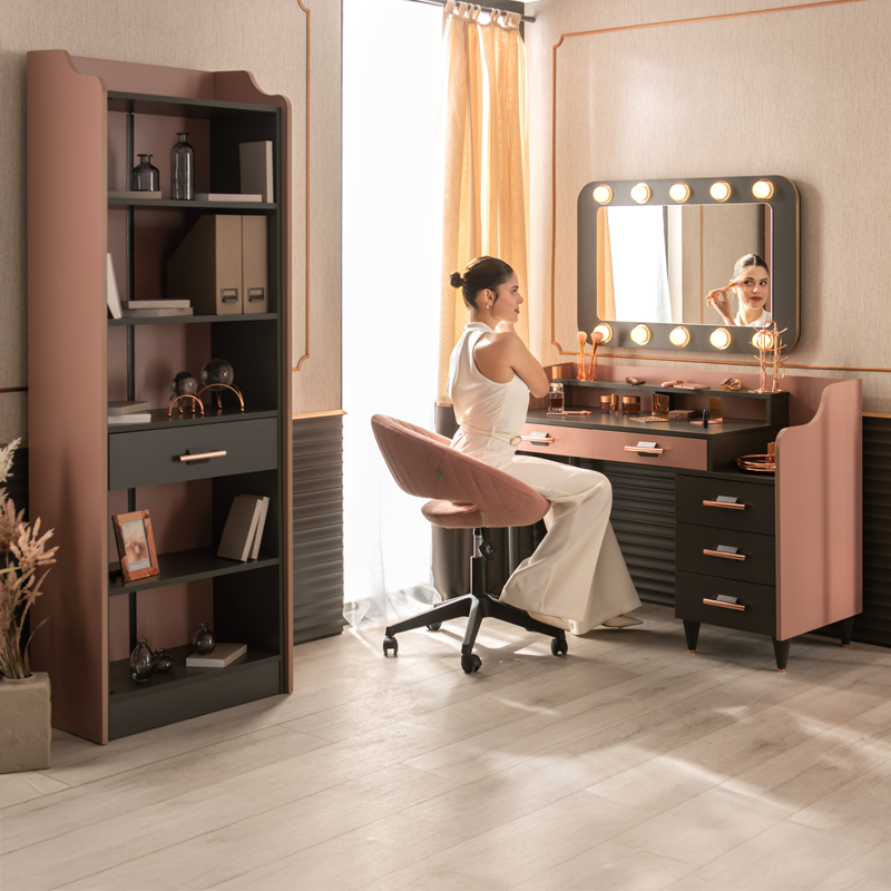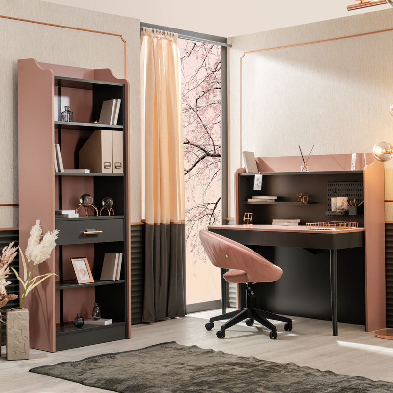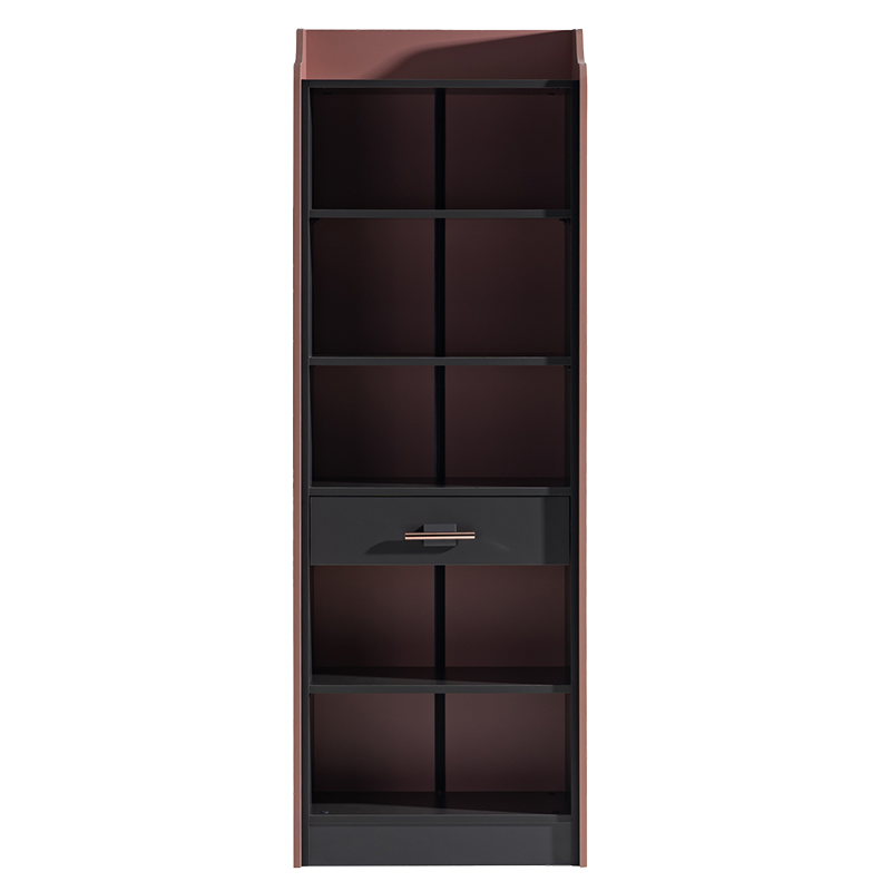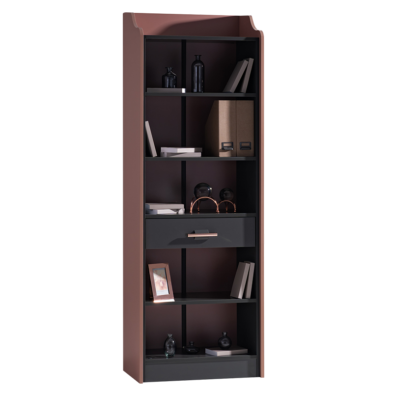 Етажерка за книги е проектирана за да внесе ред и стил в стаята. Със своите 6 рафта и централно чекмедже с елегантна дръжка тя предлага достатъчно пространство за съхранение както на книги и списания така и на декоративни предмети. Всеки рафт издържа до 25 кг и може лесно да се премахва или пренарежда според нуждите. Чекмеджето е оборудвано с механизъм с плавно затваряне осигуряващ тиха и безопасна употреба. Изработена от висококачествен 18 mm материал етажерката е устойчива и стабилна като съчетава модерен и изискан дизайн за елегантен завършек на интериора. Пълна информация за размерите и характеристиките на модела ще намерите в таблицата в таб/поле ‘Техническа информация’