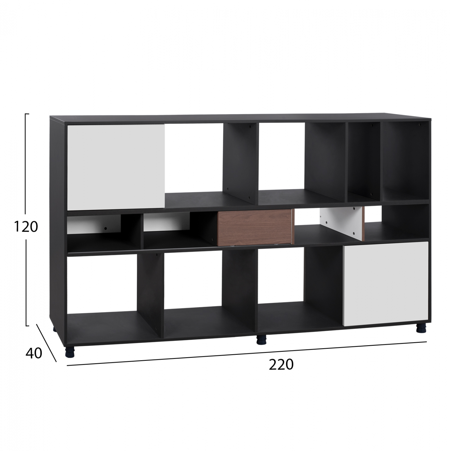 Продуктът разполага с просторни и разнообразни по размер отделения, които осигуряват максимално удобство и гъвкавост при организиране на личните ви вещи. Създаден е от висококачествени материали, гарантиращи дълготрайна устойчивост и стабилност. Комбинацията от тъмни и светли панела придава на тази библиотека рафиера изключителна визуална привлекателност.