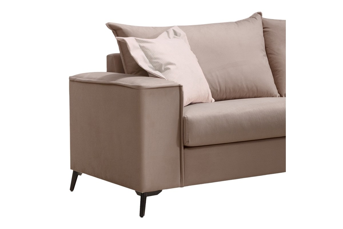 Диванът разполага с удобни възглавници, които осигуряват комфорт и подкрепа при сядане. Конструкцията му е стабилна, благодарение на устойчива рамка, която гарантира дълготрайна употреба. Краката са изработени от здрав материал, придаващ допълнителна стабилност и стил.
