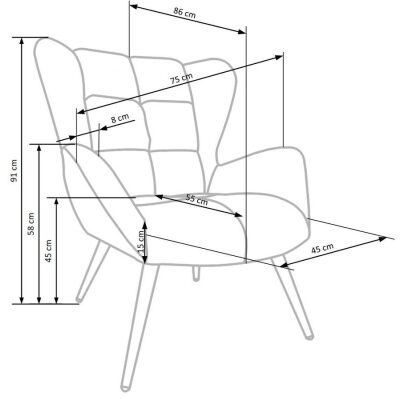Размери: ширина: 75 см – дълбочина: 86 см – височина: 91 см – височина на седалката: 48 см Материал: – кадифена материя 40 – прахово боядисана стомана