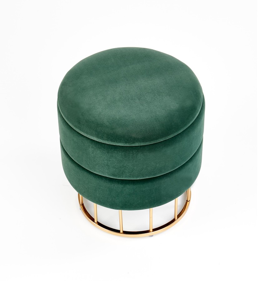 Окръглата пъф е зразна конструкция, която е подходяща както за допълнително място за сядане, така и за стилен табурет, поставен до фотьойл или ъглов диван. Пъфът е с малки размери и е тапициран с велур в тъмен зелен цвят — материал, който е устойчив и лесен за почистване, мек на допир и се представя естетически и впечатляващо. Елегантният пъф се държи на окръгла основа, декорирана с декоративни пелерини — изработена е от хромирана стомана в златист цвят. Този пъф може лесно да бъде преместван от една стая в друга. Освен това, моделът не само предлага мека и удобна седалка, но също така е уникална декорация, която подчертава съвременната обстановка в интериора.