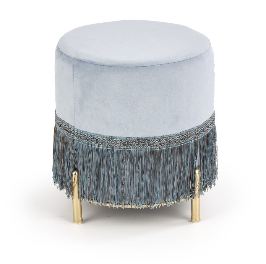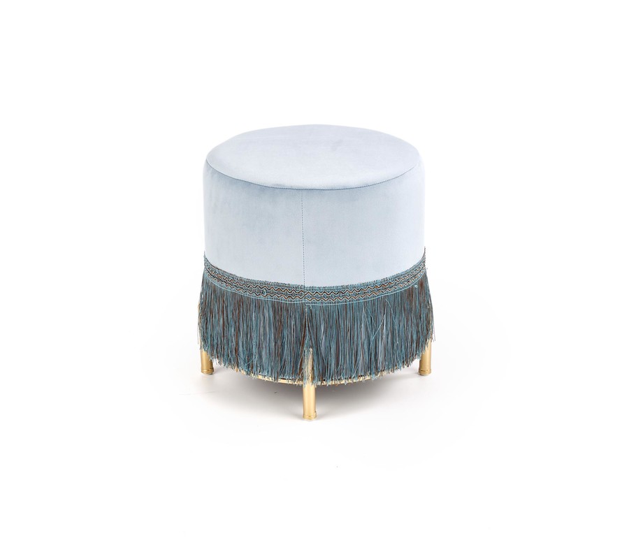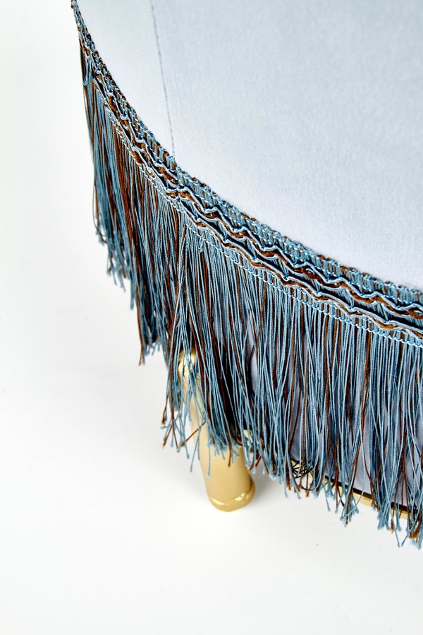 Ясносинята пуфка е компактна форма с високо естетично завършване – перфектно ще се впише в пространството на дневната или модерната стая за тийнейджъри. Окръглената пуфка е тапицирана с велурена тъкан – материала е приятен на допир, впечатляващо изглежда и е лесен за поддържане в чистота. Ясносинят цвят идеално ще се съчетае с интериор, завършен в скандинавски или минималистичен стил, в който доминира универсалната, почти сдържана цветова гама. Долната част на пуфката е украсена с декоративни реснички, които придават на цялата форма уникален характер. Леката мебел се поддържа на ниски крачета, изработени от хромирана стомана в златист оттенък. Кодът ще бъде идеално допълнително място за сядане, когато няма достатъчно място за гости, а също така ще се използва и като стилен крак, който поставяме в близост до релаксиращия фотьойл.