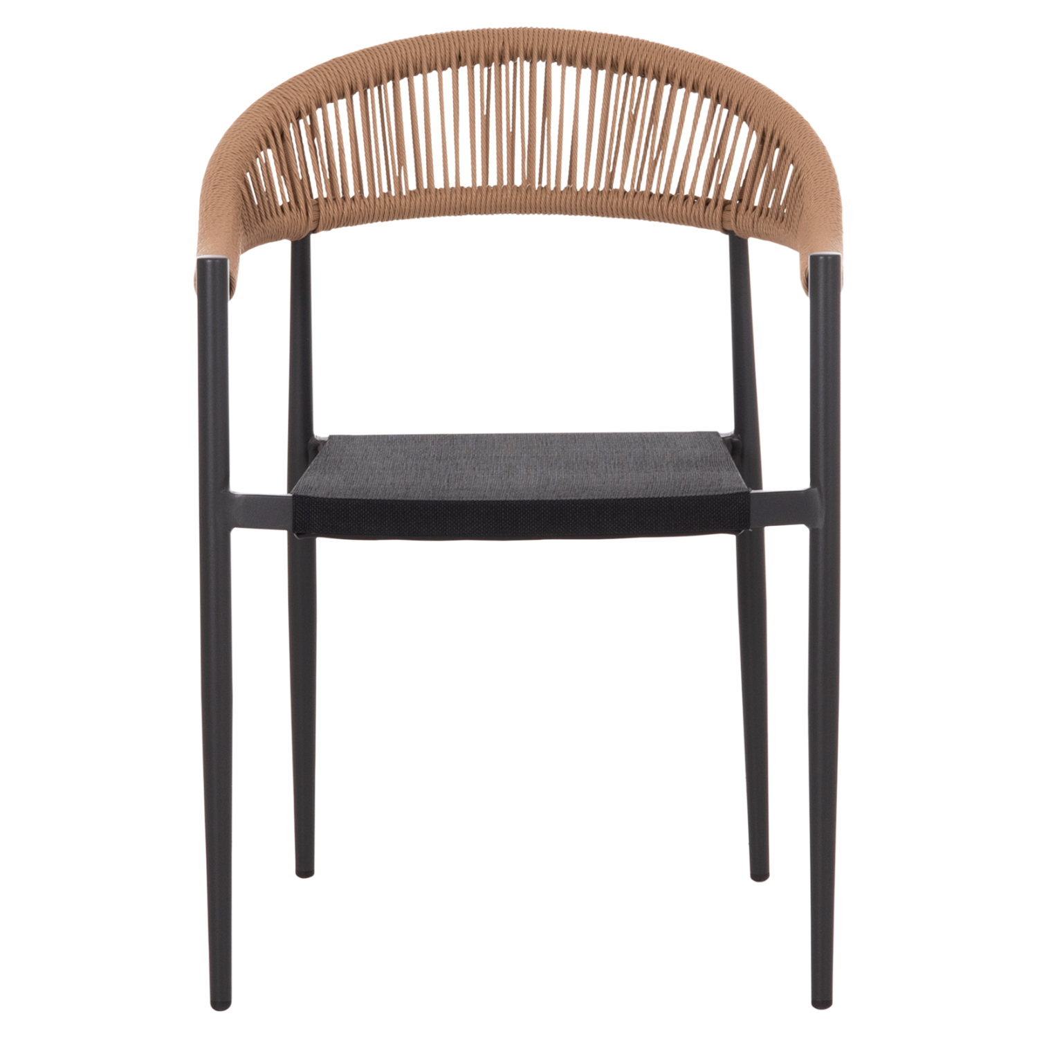 Калъфът на седлото е в контрастен черен нюанс, предлагайки стилно подчертаване на дизайна. Облегалката е изработена от плетен текстил в топъл, земен цвят, който създава уютна и приветлива атмосфера. Визията на продукта е изключително модерна, което го прави идеален за всяка уредена трапезария, кът за кафе или открито пространство.