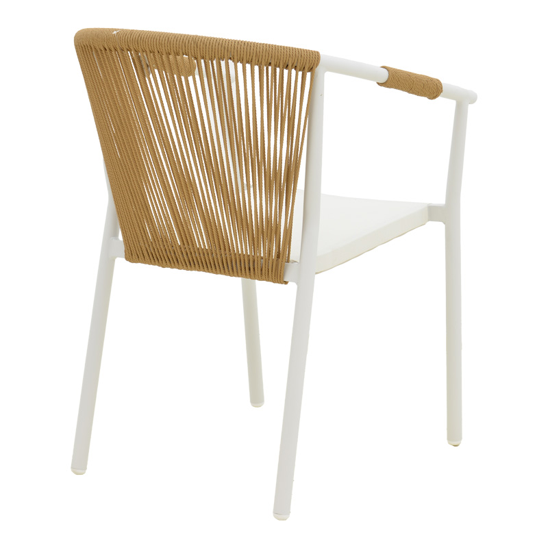 Седалката и облегалката са изработени от плетен текстил, който предлага не само комфорт, но и дишаща структура, позволяваща приятно усещане дори в горещите летни дни. Бялата метална рамка осигурява стабилност и издръжливост, като същевременно придава модерен вид.