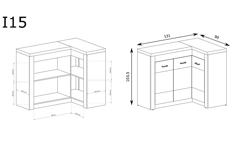 Шкафът е наличен както в ляв, така и в десен вариант с акцентна декорация отпред. Забележка: LED осветлението не е включено в цената, но можете да поръчате LED осветителна шина за модул I-15 за пълен завършек на вашия интериор.