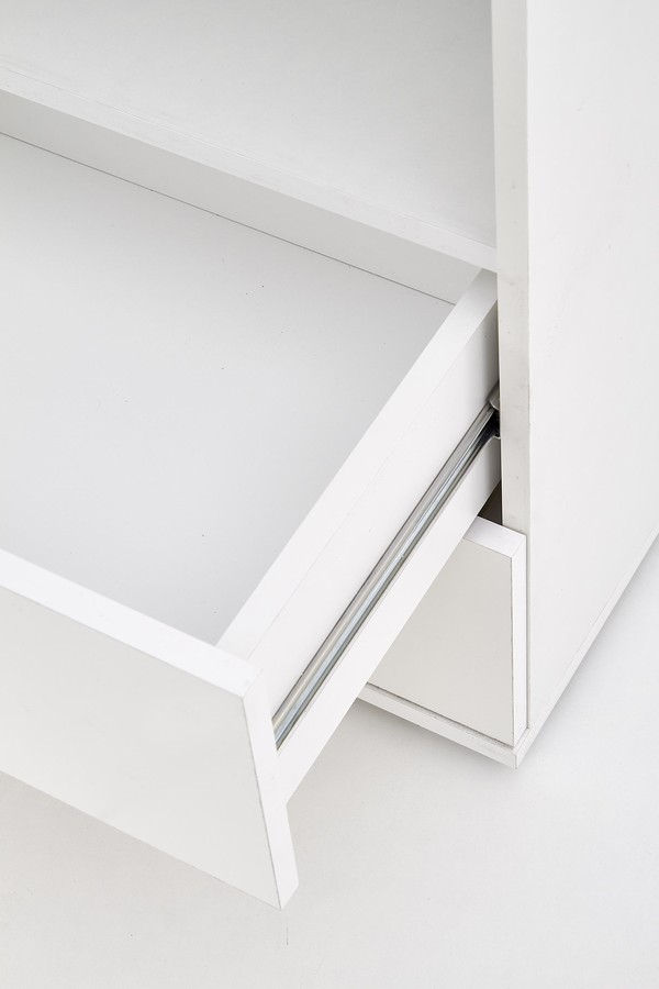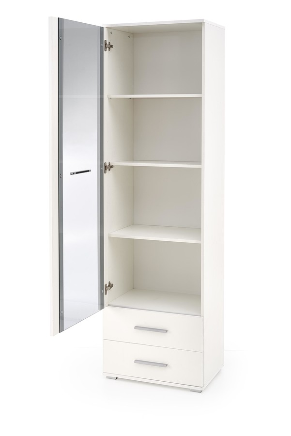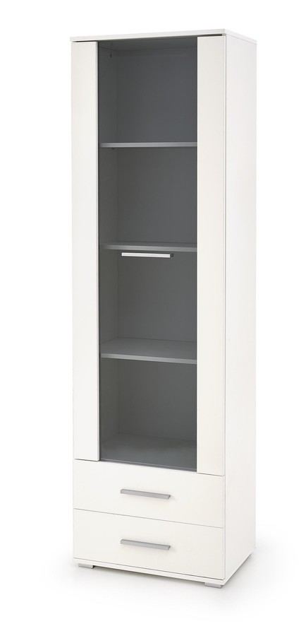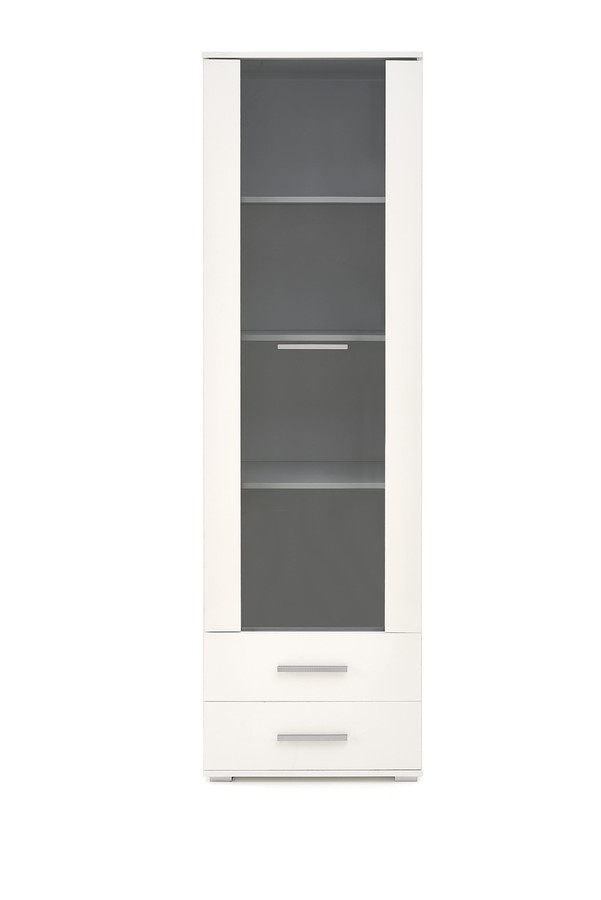 Бялата витрина е интригуващ елемент в обзавеждането на хола — тя не е само елегантна, но и многофункционална. Витрината ще служи за съхранение, но също така и за експониране на избрани предмети. Струва си да се спомене, че благодарение на закритите, но прозрачни предни части, всички предмети са защитени от прах и случайно падане. Процесът на производство на стилната витрина включва ламинирана мебелна плоча, чийто ръбове са допълнително обработени с ABS кант. Благодарение на използваните материали витрината има увеличена устойчивост на надраскване, замърсявания и удари. Освен две просторни чекмеджета, витрината разполага с четири рафта, които са достъпни зад стъклото — проектът позволява експонирането на ценни предмети. Представената витрина великолепно ще се комбинира с другите мебели от колекцията.