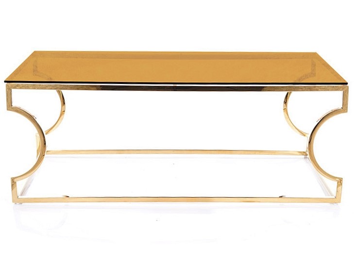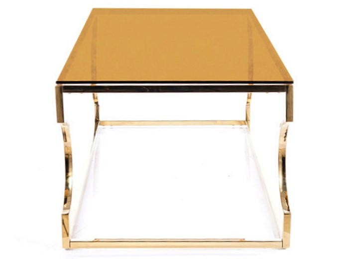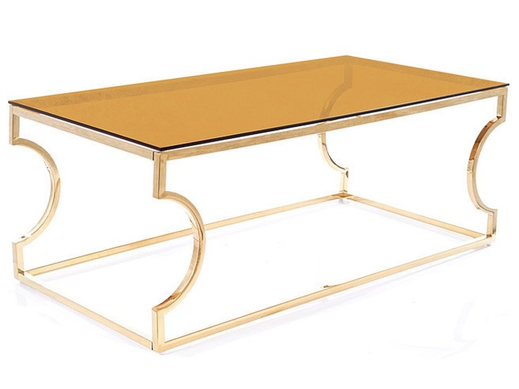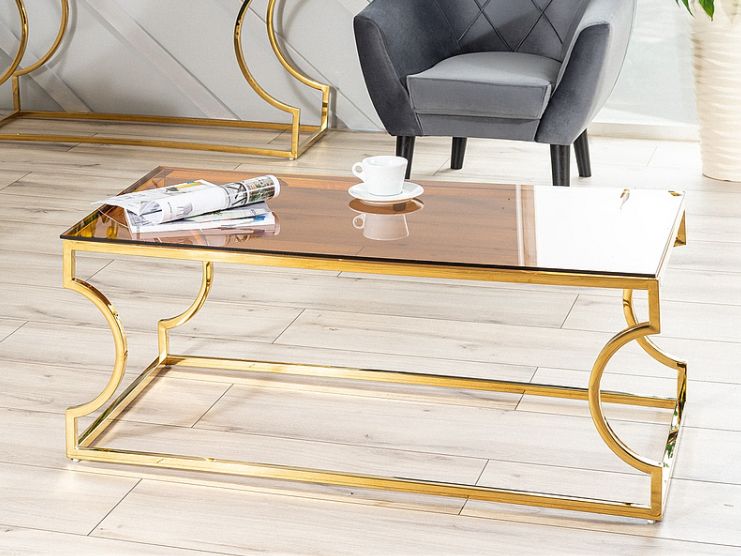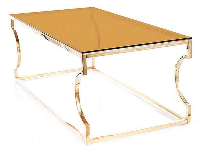 Холна маса – е много оригинално мебел, който е създаден според модерните стандарти за стил Glamour. Следователно, пейката е най -подходяща за богато завършен интериор. Мебелите могат да се използват в домашния интериор, например в хол, в стая за гости или дори на терасата. Основата на пейката е направена от златна неръждаема стомана. Четири крака отминават от рамката, които в средата на височината им имат ефективен полукръг, а в основата се свързват в правоъгълник. Това се отразява на естетиката на целия проект. Кафяв връх от пушено закалено стъкло се основава на златна рамка, която е в Амбър. Цялото изглежда изключително елегантно. Този модел се предлага в различни размери. Продуктът се доставя на клиента в елементи и изисква собствен монтаж.