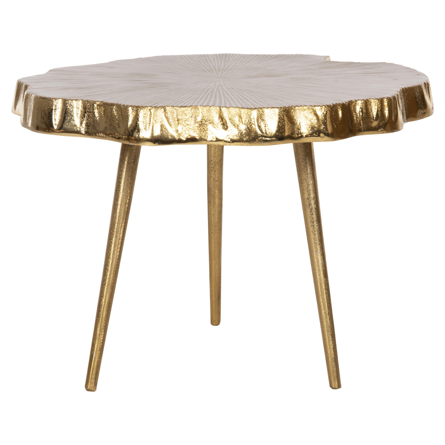 Тази помощна маса е истински акцент в интериора, съчетаваща уникален дизайн и висока функционалност. Повърхността ѝ се отличава с неправилна форма, напомняща на природни елементи, като вдъхновението от органичните форми носи природна хармония във вашия дом. Цветът е топъл и богат, разкривайки красиви отблясъци, които променят настроението в стаята и добавят усещане за лукс.