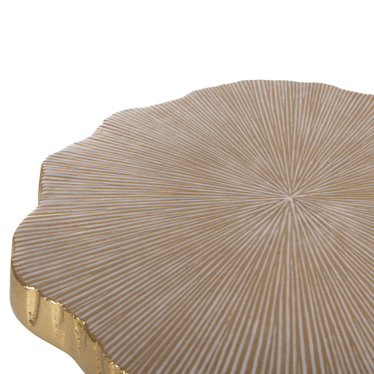 Този помощен плот е шедьовър на изящество и функционалност, съчетаващ елегантен дизайн с високо качество на материалите. Металическата конструкция придава стабилност и дълготрайност, като запазва лекота и финес във всяко детайлче. Плотът е обработен със специална техника, която му придава текстурирана структура, напомняща дървесета годишни кръгове, допълнена с ефектна метална повърхност в златист цвят.