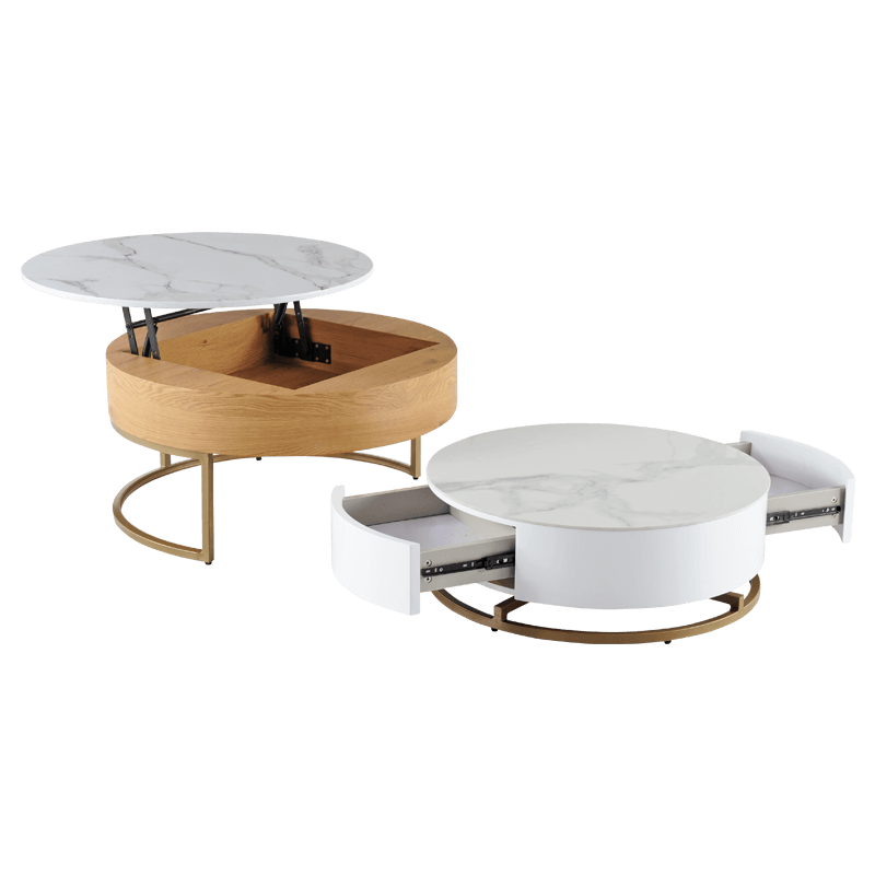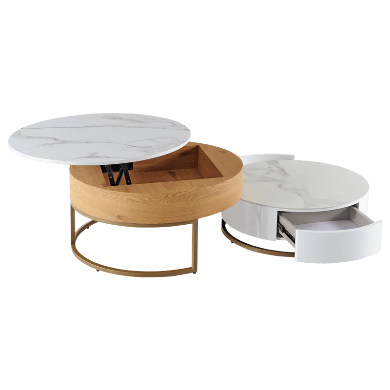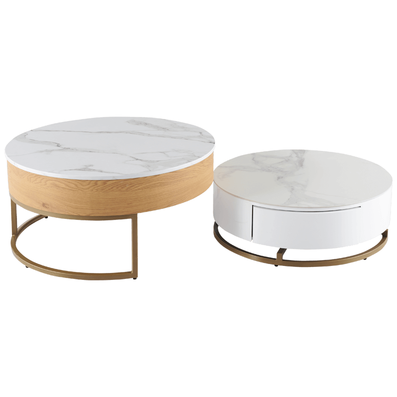 1 е комплект от 2 холни масички с модерен дизайн. Те имат основа от праховобоядисан метал в златист цвят. на масите в комплекта са изработени от (за голямата) с 15 мм дебелина и керамика (за малката) с 5 мм дебелина, а страничния им борд от МДФ. притежава практична повдигаща функция и две компактни чекмеджета за съхранение. информация за размерите и характеристиките на модела ще намерите в таблицата в таб/поле информация“.
