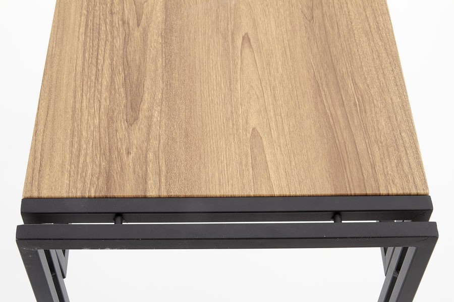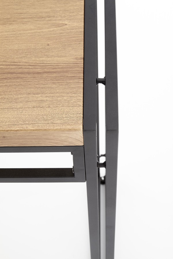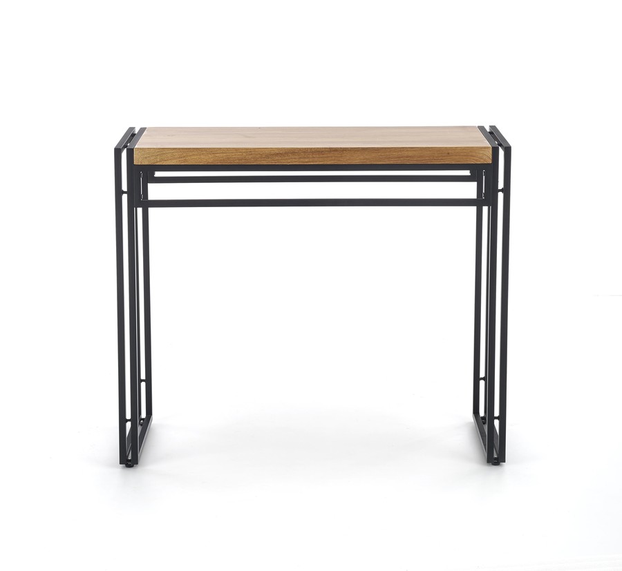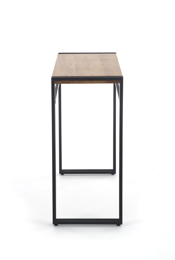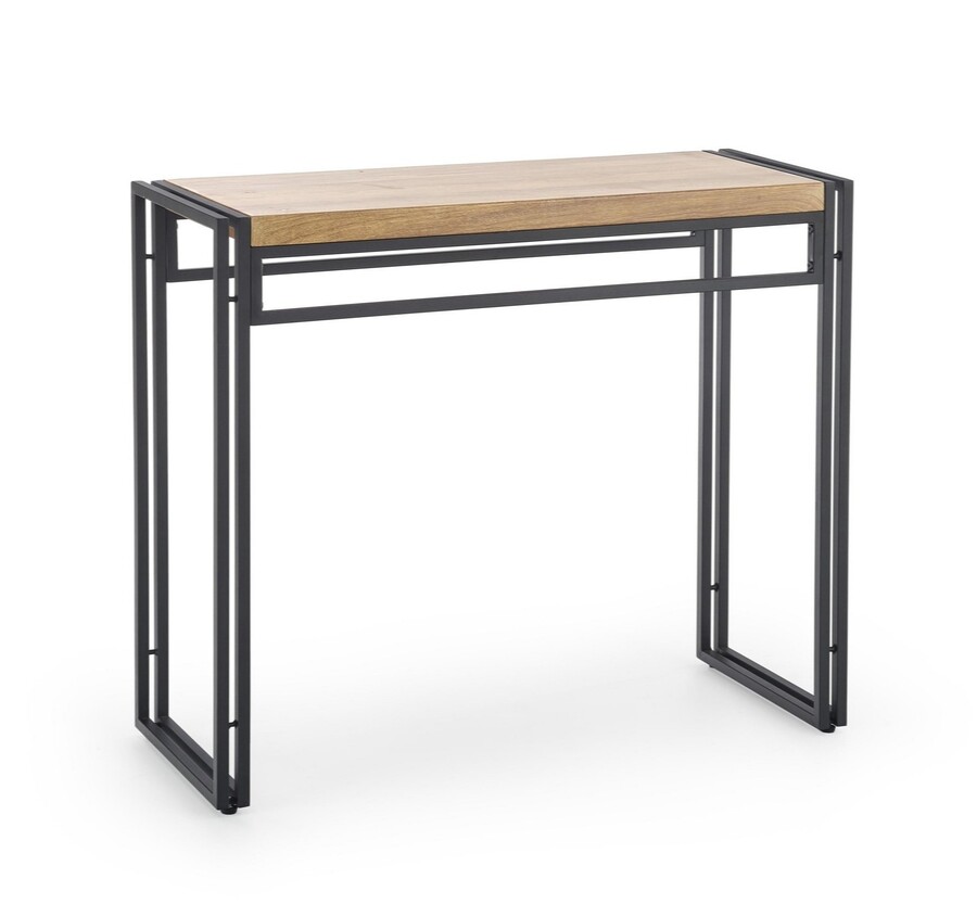 Ковзолна маса – има плот, изработен от ламиниран златен дъб на MDF. Рамката е направена от черна боядисана стомана. Материалът на базата на дърва дават на конзолния суров дизайн, поради което мебелите ще се съчетаят добре с аранжировки в стил таванско помещение. Той ще работи и в съвременния интериор. Конзолата маса може да играе много роли в интериора. Можете да го поставите в хола и да поставите декорации на тезгяха или да използвате като тоалетка. Благодарение на малкия размер, конзолата дори ще се побере в малки пространства.