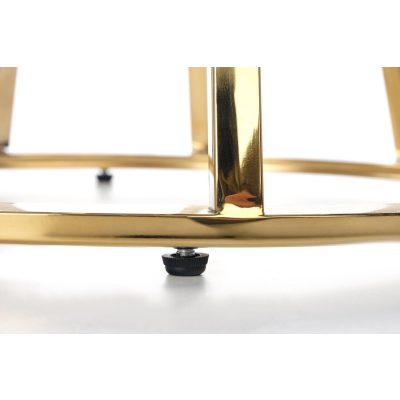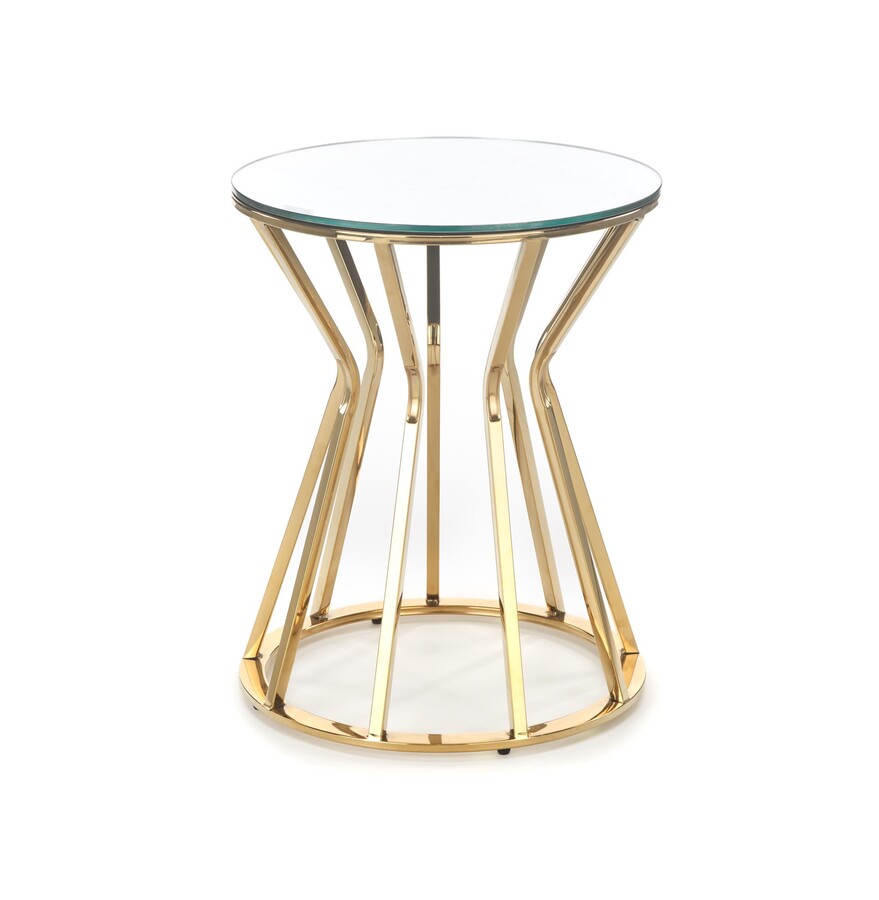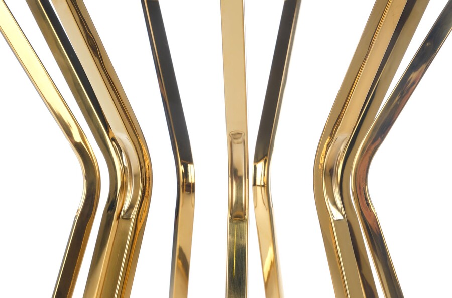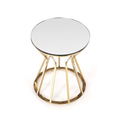 Кръглата масичка е красив детайл, който ще бъде перфектно за кафе или спомагателна маса. Перфектно се вписва в интериора на елегантни салони и домашни офиси. Гладката му огледална повърхност е лесна за почистване, а липсата на ръбове е чудесно решение за родителите на малки деца. Масичката е елемент от интериорен дизайн, който се вписва идеално в стаи, декорирани в стила на блясъка. Стабилна рамка с оригинална, огъната конструкция беше направена от златна неръждаема стомана, докато плота – изработен от стъкло.
