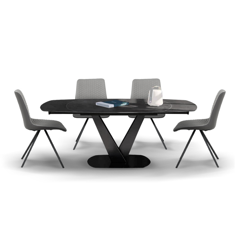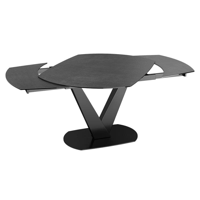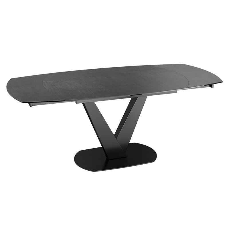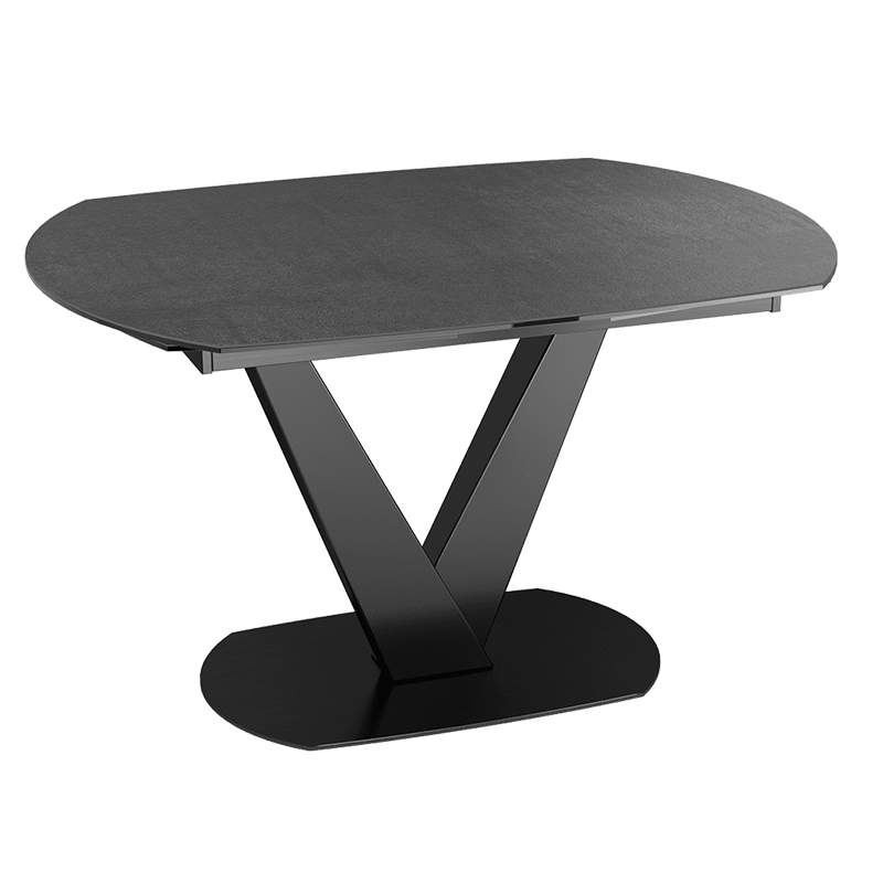 Трапезната маса е от висок клас с разтегателен механизъм. Плотът е изработен от керамика и закалено стъкло с дебелина 10 мм. В неразтегнато състояние масата е с дължина 130 см, а при нужда може да се удължи до 190 см, за да посрещнете повече гости. Основата е стабилна, изработена от праховобоядисан метал. Подробна информация за размерите и характеристиките на модела можете да намерите в таб/поле „Техническа информация“.