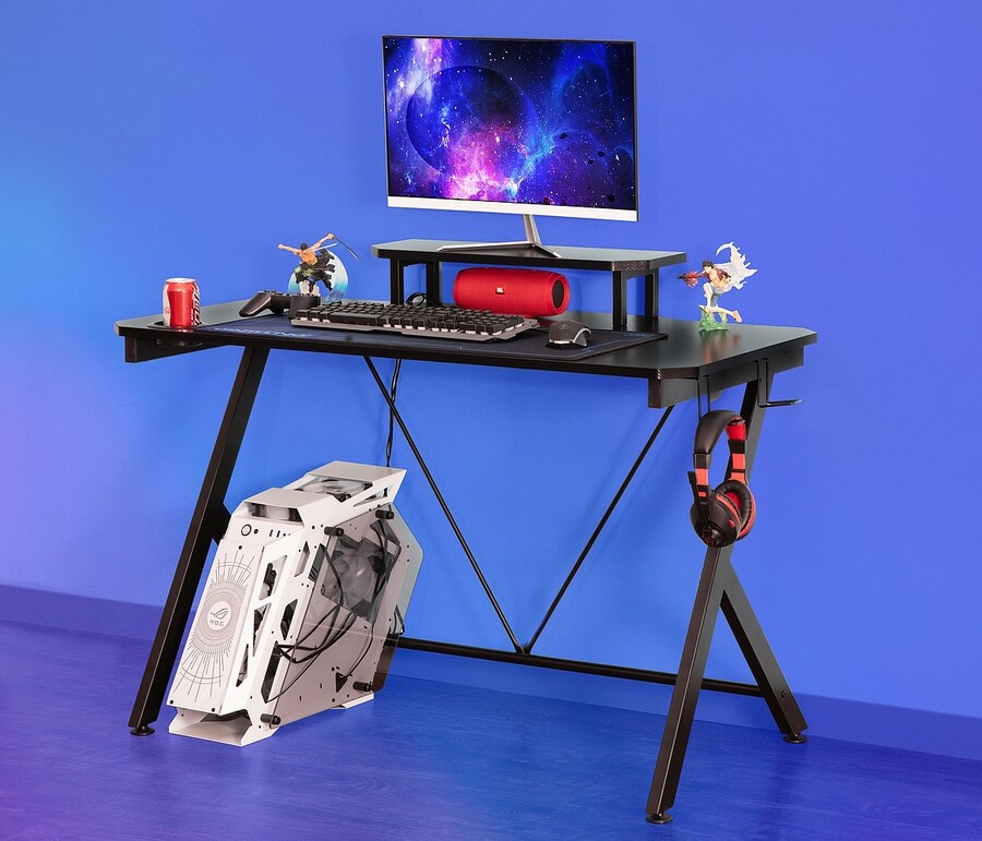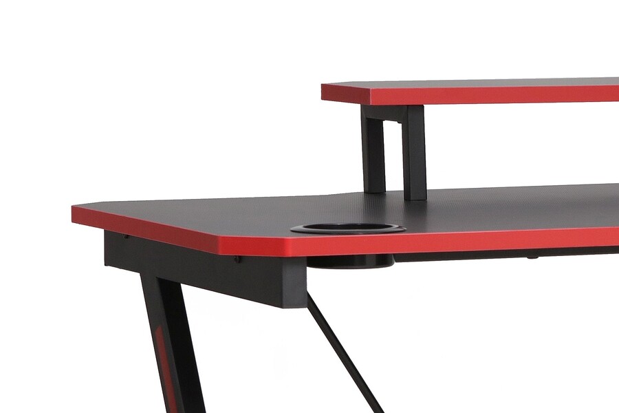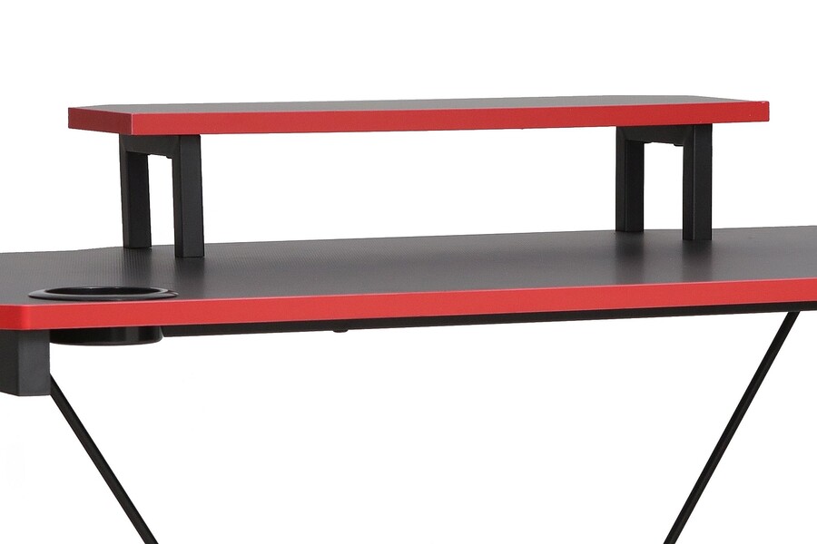 Размери: ширина: 120 см – дълбочина: 60 см – височина: 76 / 88 см Материал: – плот: ламиниран картон – рамка: метал Цвят: червен / матово черно Бюрото е с поставка за чаша и слушалки.
