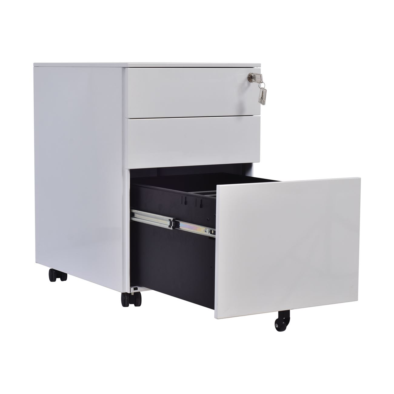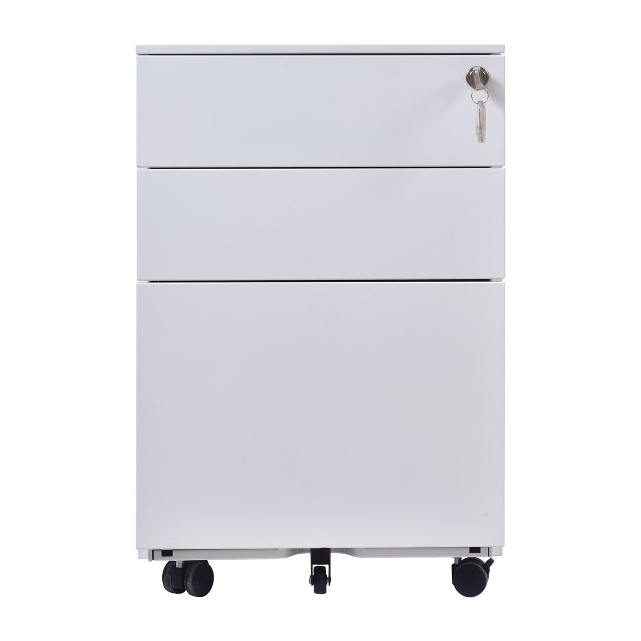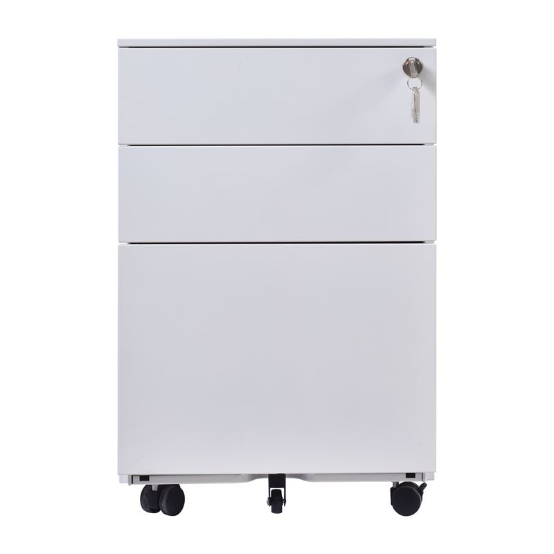 Бяла метална шкафче с три чекмеджета, запиращи се с ключ. Размери: 39 см ширина, 52 см дълбочина и 60 см височина. Моделът се отличава с изчистен и модерен дизайн, който се вписва идеално във всяко офис или домашно пространство. Металната конструкция гарантира дълготрайност и стабилност, като в същото време е лека и лесна за преместване. Горният панел предлага удобство за съхранение на дребни предмети, като ключове и мобилни устройства, докато по-дълбоките долни чекмеджета осигуряват място за документи и канцеларски материали. Колелцата са снабдени със заключваща функция, което предлага допълнителна стабилност при нужда.
