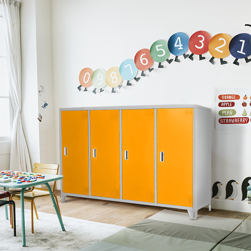 Метален шкаф с четири плътни врати, които се затварят с магнитна система. Всяко отделение разполага с рафт с товароносимост до 40 кг, вграден лост за закачалки и вентилационен отвор за добра циркулация на въздуха. Моделът е снабден с крака с височина 10 см, които улесняват почистването под шкафа. Изработен е от праховобоядисан метал с грапаво-шагрен покритие, подходящ за оборудване на детски градини. Пълна информация за размерите и характеристиките на модела ще намерите в таблицата в таб/поле ‘Техническа информация’.