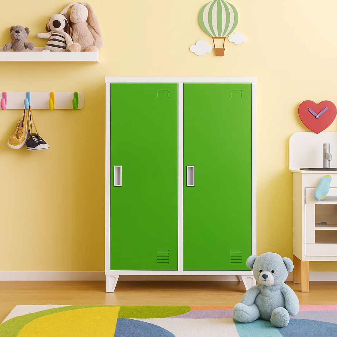 Метален шкаф е двоен гардероб с две плътни врати, които се затварят с магнитна система. Всяко отделение разполага с рафт с товароносимост до 40 кг, вграден лост за закачалки и вентилационен отвор за добра циркулация на въздуха. Моделът е снабден с крака с височина 10 см, които улесняват почистването под шкафа. Изработен е от праховобоядисан метал с грапаво-шагрен покритие и е подходящ за оборудване на детски градини. Пълна информация за размерите и характеристиките на модела ще намерите в таблицата в таб/поле ‘Техническа информация’.