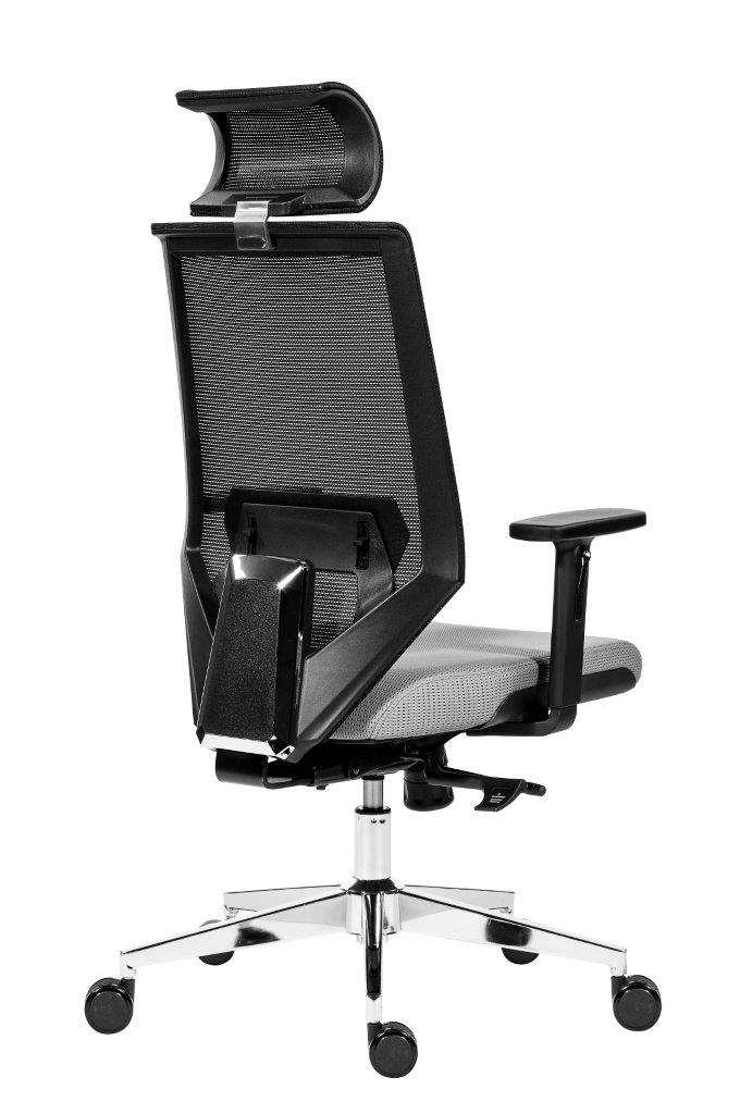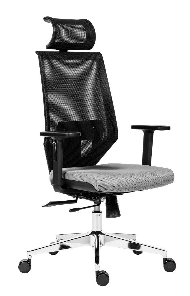 Работен стол с черна мрежеста облегалка и тапицирана седалка в сив цвят. SYN – синхронен механизъм с три позиции на заключване, релакс функция и настройване силата на люлеене според теглото на седящия. Газов механизъм за регулиране височината на седалката. Регулируема лумбална опора, регулируеми на височина подлакътници и регулируема облегалка за глава PDH. Хромирана кръстачка с колелца за всички видове настилки. SL – механизъм за регулиране дълбочината на седалкатa. Максимално натоварване до 130 кг. Сертифициран от SZÚ – Европейски инженерно-изпитателен институт. Гаранция 36 месеца.