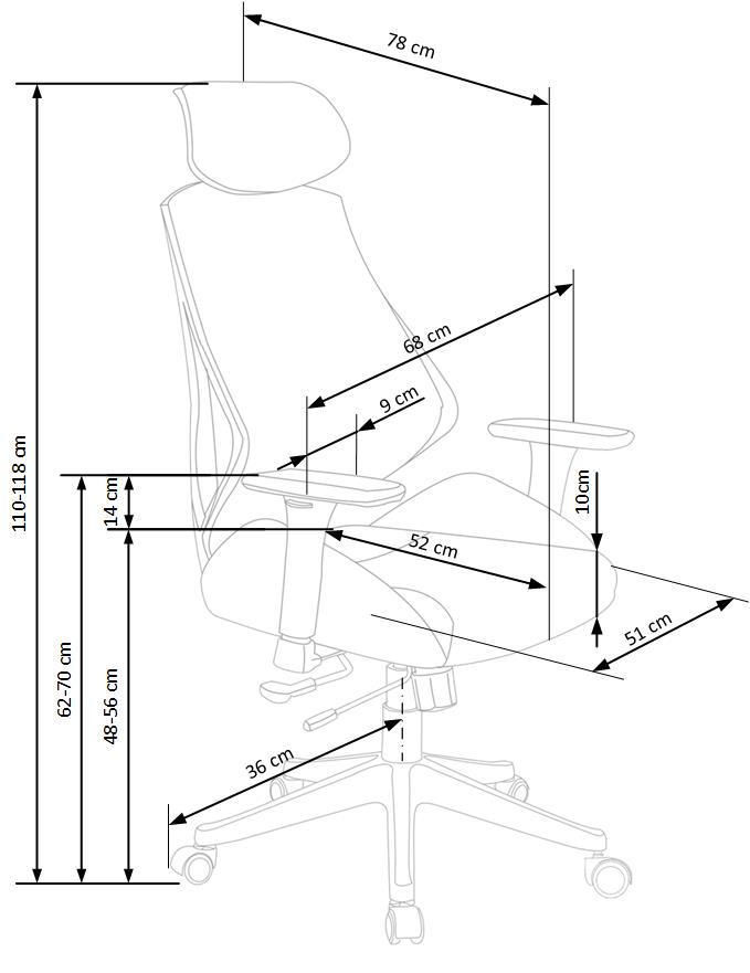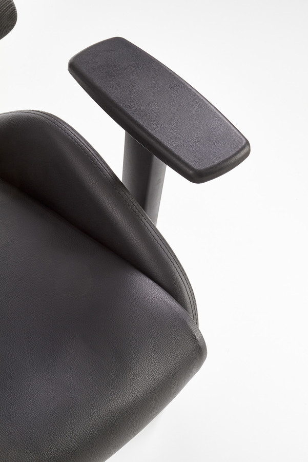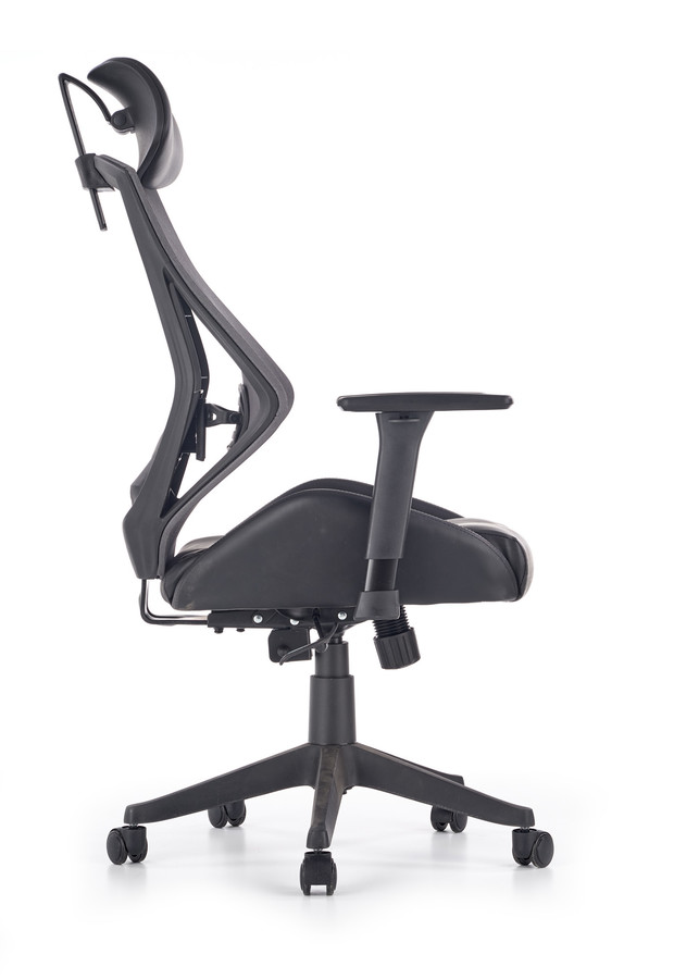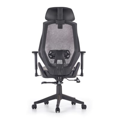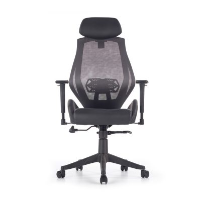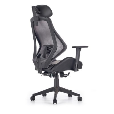 Ръководителският стол съчетава седалка и облегалка за глава, тапицирани с черна екокожа, с контурирана облегалка, изработена от дишаща пепелявосива мрежа. Модернистичният, геометрично оформен дизайн е оборудван с усъвършенстван механизъм , който предлага естествено люлеещо се движение. Освен това, тази функция позволява синхронно движение на седалката и облегалката, както и заключването им в избрана позиция. Допълнителна функция предпазва потребителя от удар от облегалката, когато заключването е освободено. Тапицерията от екокожа е известна с лесното си почистване и повишена устойчивост на повреди. Друга атрактивна характеристика на въртящия се стол са регулируемите му подлакътници, които могат да се регулират нагоре и надолу. Този модел е разположен върху стабилна основа, състояща се от пет колелца, което увеличава максимално мобилността на стола. Размери: ширина 68 см – дълбочина 78 см – височина 110 – 118 см Материал: – екокожа – мрежа Максимално натоварване: 120 кг