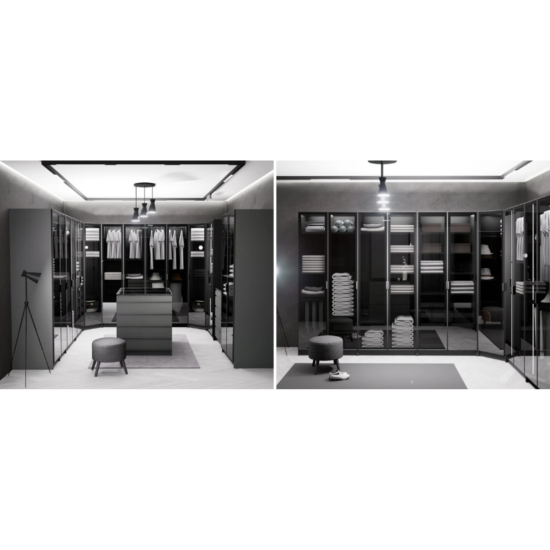 Еднокрилният гардероб съчетава елегантен дизайн и функционалност. Гардеробът се предлага без врата, която може да бъде закупена допълнително ; врата от опушено стъкло с огледален ефект, придаваща модерен акцент и усещане за простор. Вътрешното пространство предлага практично разпределение с рафтове, лост за закачалки и две изтеглящи се кошници. Вграденото осветление с 10 режима на работа и дистанционно управление осигурява допълнителен комфорт. Гардеробът може да се използва самостоятелно или в комбинация с модулите от серията в същия цвят. Пълна информация за размерите и характеристиките на модела ще намерите в таблицата в таб/поле „Техническа информация“.