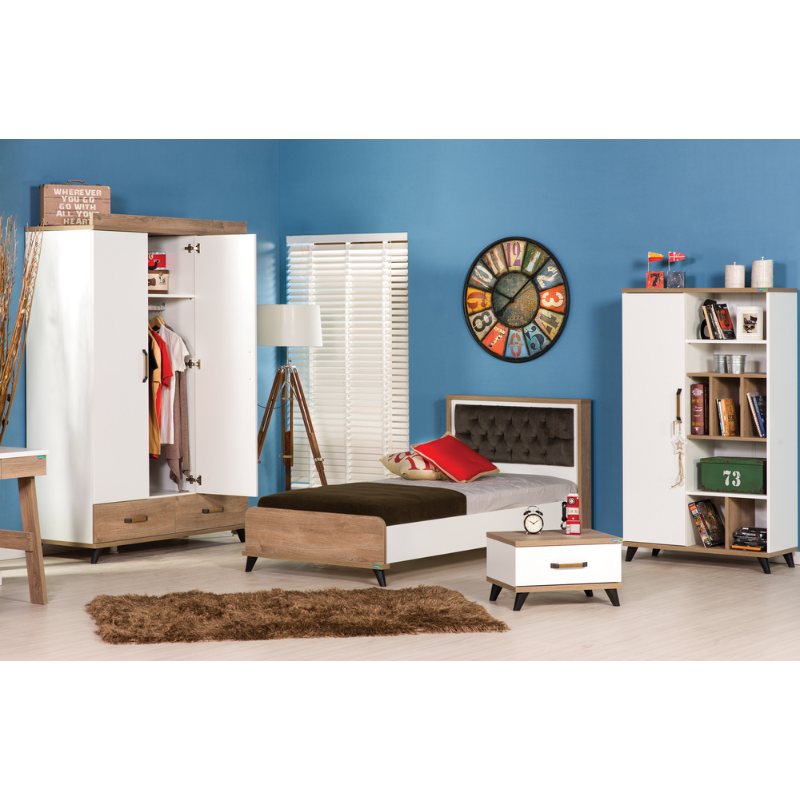Детското легло, което виждате, съчетава практичност и елегантен дизайн, като е идеално за обзавеждане на модерната детска стая. Изработено от качествени материали, то гарантира здравина и дълготрайност, които ще ви служат години наред. Леглото е конструирано с внимание към детайлите, предлагайки безопасно и комфортно място за сън на вашето дете.