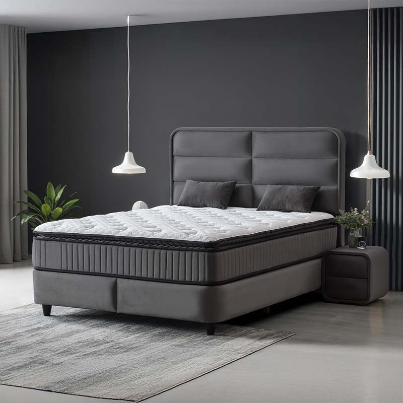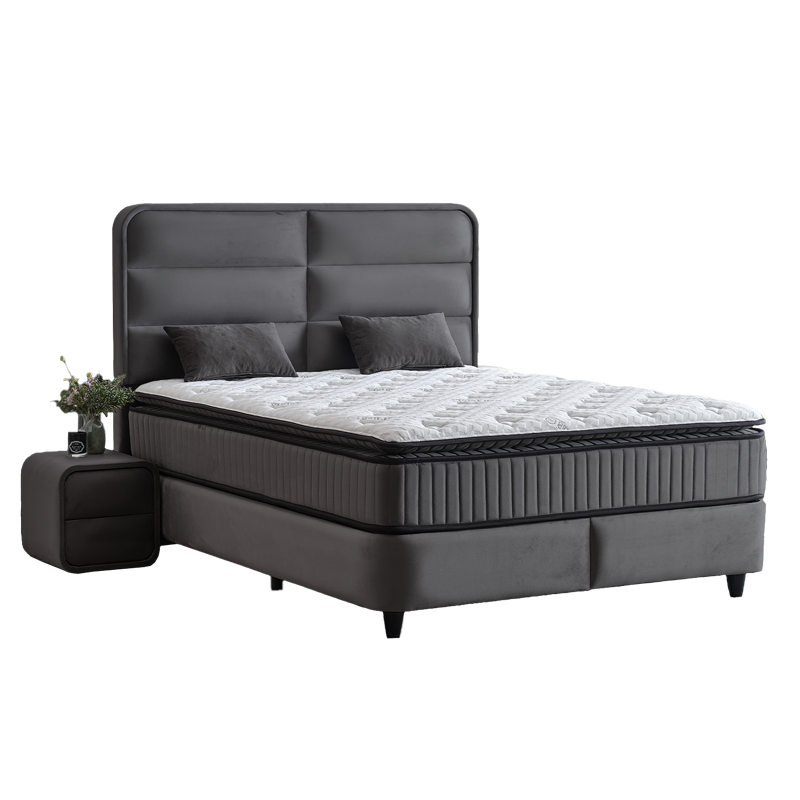спалня 140 x 200 см – тъмно сив съчетава изискан дизайн и практичност в едно. е оборудван с матрак с покет пружини, подплатен с вълна, памук и пухена вложка, за осигуряване на оптимален комфорт и поддръжка през нощта. метална подматрачна рамка гарантира дълготрайна употреба, а вградената ракла с повдигащ механизъм предлага допълнително място за съхранение. е включен в цената, което прави покупката още по-удобна. информация за размерите и характеристиките на модела ще намерите в таблицата в таб/поле “Техническа информация”.
