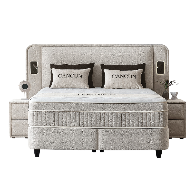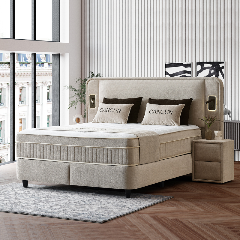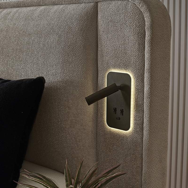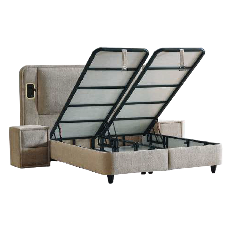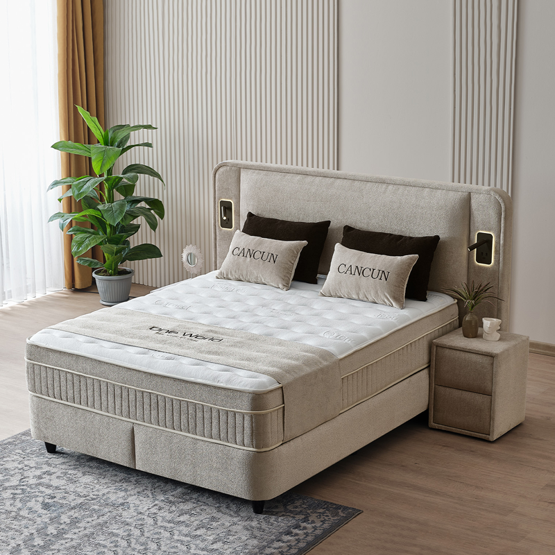 Тапицирана спалня с матрак 160 x 200 впечатлява със своя минималистичен силует и модерна естетика. Високата табла е тапицирана с мек текстил и разполага с интегрирано LED осветление от двете страни което създава приглушена и спокойна светлина – идеална за вечерна почивка. Моделът е отличен избор за по-големи спални помещения където комфортът и стилът вървят ръка за ръка. Под матрака е разположена практична ракла за съхранение осигуряваща допълнително място за подредба. Включеният двулицев матрак съчетава покет пружини еластична пяна и пухена вложка осигурявайки меко усещане и надеждна опора за тялото. Пълна информация за размерите и характеристиките на модела ще намерите в таблицата в таб/поле ‘Техническа информация’