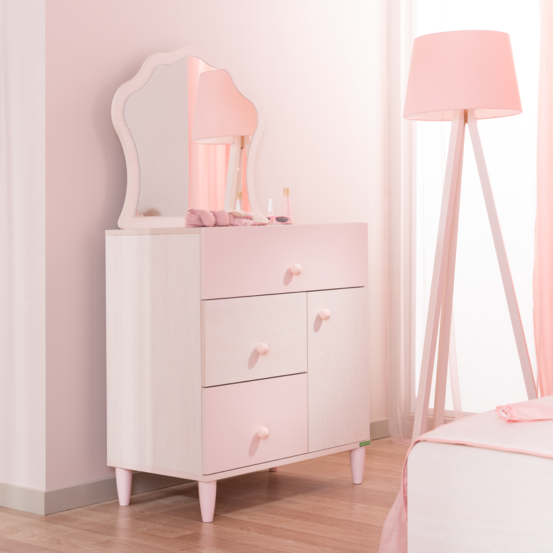 Детски скрин съчетава свежи пастелни тонове с практичен дизайн, подходящ за съхранение на дрехи, аксесоари и други необходими вещи в детската стая. се с меки форми, хармонични цветове и детайли, които го правят едновременно функционален и очарователен. разполага с три чекмеджета и врата, което осигурява гъвкаво разпределение. са изработени от 18 и 8 мм и издържат до 25 кг, като са оборудвани с механизъм с плавно затваряне. също е със спирачка за безшумно използване. Пълна информация за размерите и характеристиките на модела ще намерите в таблицата в таб/поле информация’.