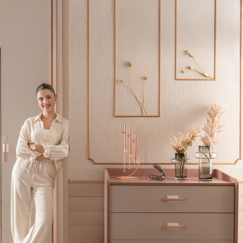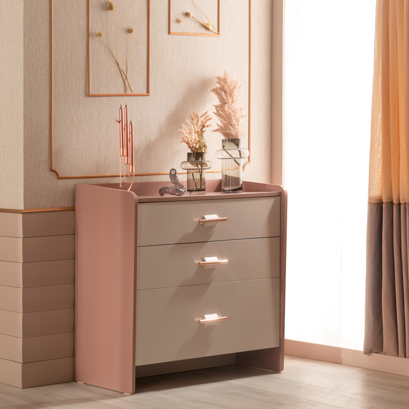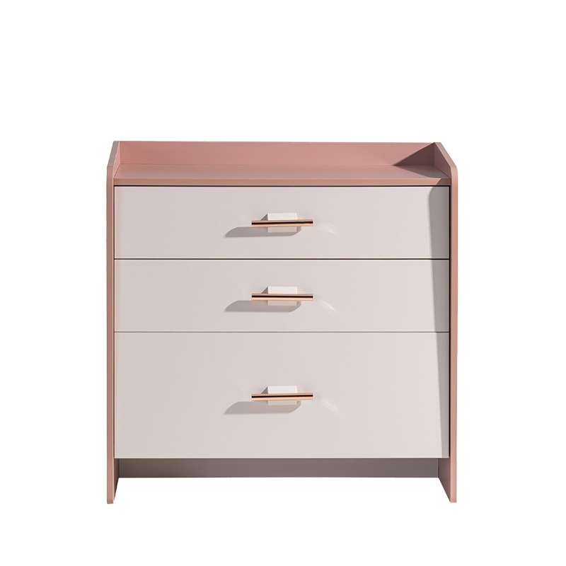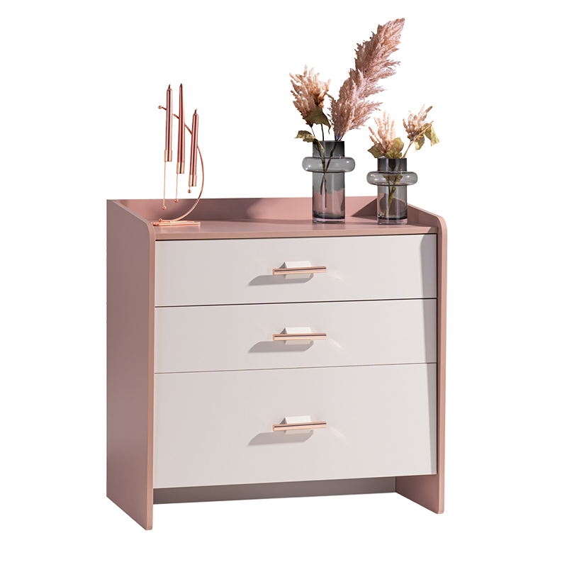 Детски скрин за дрехи съчетава функционалност елегантност и безопасност. С три практични чекмеджета той осигурява достатъчно място за съхранение на детски дрешки и аксесоари. Долното чекмедже е по-високо което го прави особено подходящо за по-обемни вещи. Розово-златистите метални дръжки придават фин завършек и изискан акцент. Благодарение на вградената система с плавно затваряне чекмеджетата се отварят и затварят меко и безшумно – за допълнително удобство и сигурност в детската стая. Пълна информация за размерите и характеристиките на модела ще намерите в таблицата в таб/поле ‘Техническа информация’