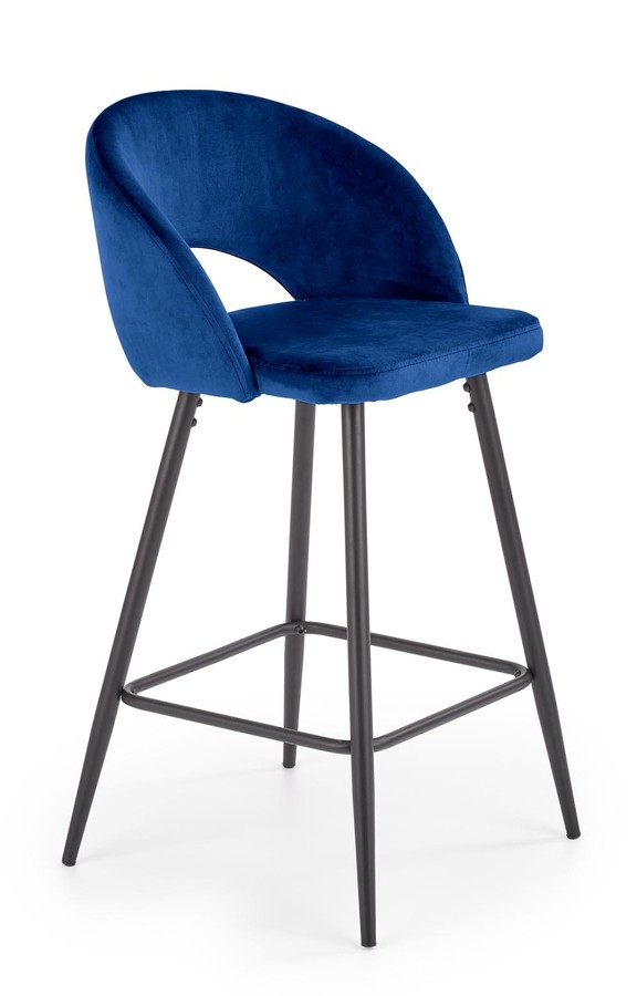Тъмно синя табуретка със заоблена облегалка е индустриална мебел, която ще се впише идеално в пространството на всекидневната до бара, както и в трапезарията и кухнята до кухненския остров. Модерната табуретка с подлакътници е поставена върху високи струговани крака, които са изработени от черна прахово боядисана стомана. Седалката заедно с профилираната и фино заоблена облегалка е тапицирана с кадифена дамаска, която е мека и приятна на допир и в същото време не е трудна за поддържане чиста.Табуретката с височина на седалката 65 см ще осигури комфорт и при по-дълго седене, благодарение на което никой няма да изпитва дискомфорт след многочасова употреба.
