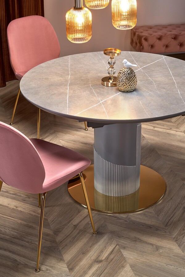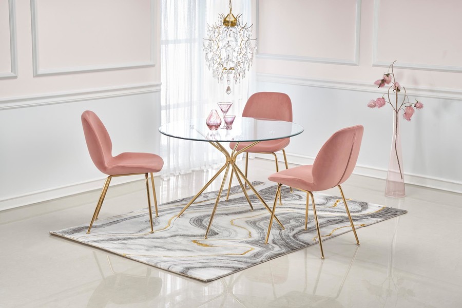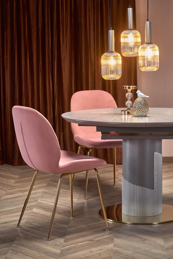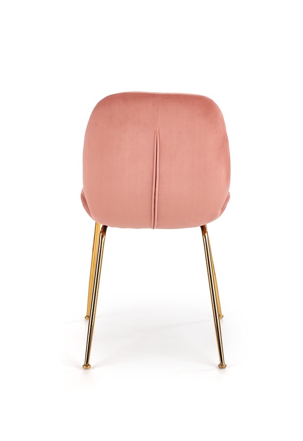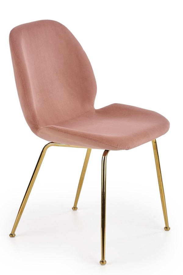 Стол – със заоблени ръбове е леко профилиран блок, който е гаранция за удобна почивка. Стабилната конструкция продължава върху трайна рамка, изработена от хромирана стомана до злато – тя завършва с малки крака, които са насочени към предотвратяване на образуването на драскотини на пода. Моделът без подлакътници е тапициран с кадифена тъкан, който е лесен за почистване, изглежда изключително естетически и мек на пипане. Розов стол, поставен върху златна основа, ще бъде идеален елемент от оборудването на хола или трапезарията, завършена в блясък и модерен стил.