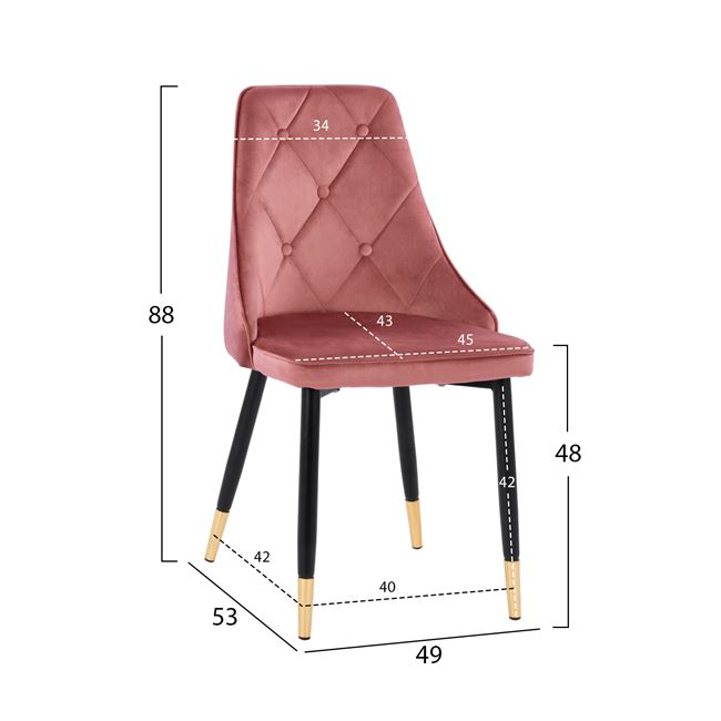 Столът Фанни е тапициран с кадифена материя и има метална рамка в черен цвят и златни детайли.В която и стая да го поставите, ще го намерите полезен.Размери: 53x50x87 cмВисочина на седалката: 48 cм