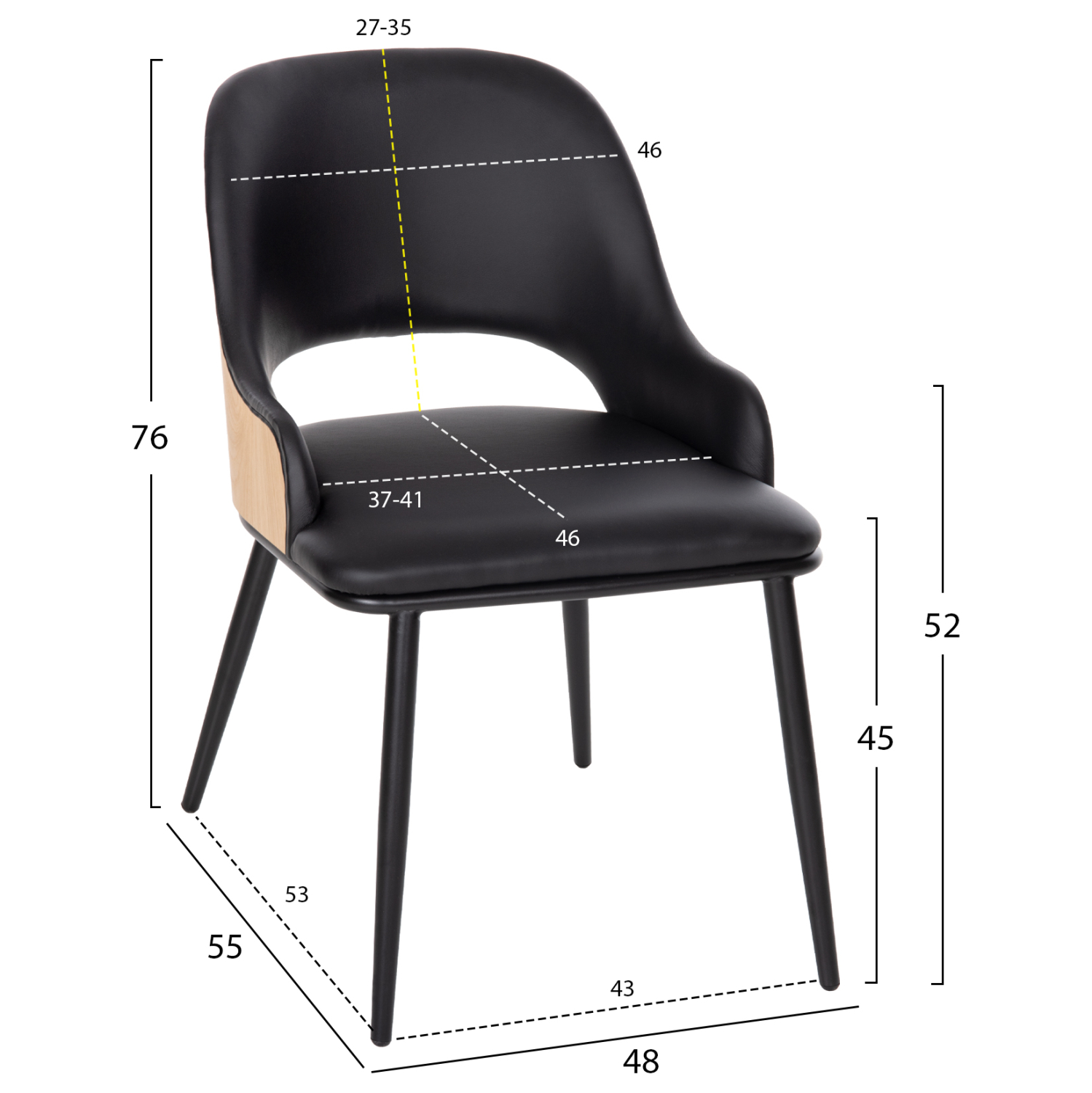 Запознайте се с елегантния и съвременен дизайн на този стол, който seamlessly съчетава стил и комфорт. Седалката и облегалката са изработени от висококачествена еко кожа, която осигурява меко и приятно усещане при седене, като същевременно предлага издръжливост и лесна поддръжка. Черният цвят придава луксозен вид, подходящ както за модерна трапезария, така и за стилен офис.