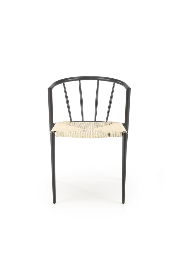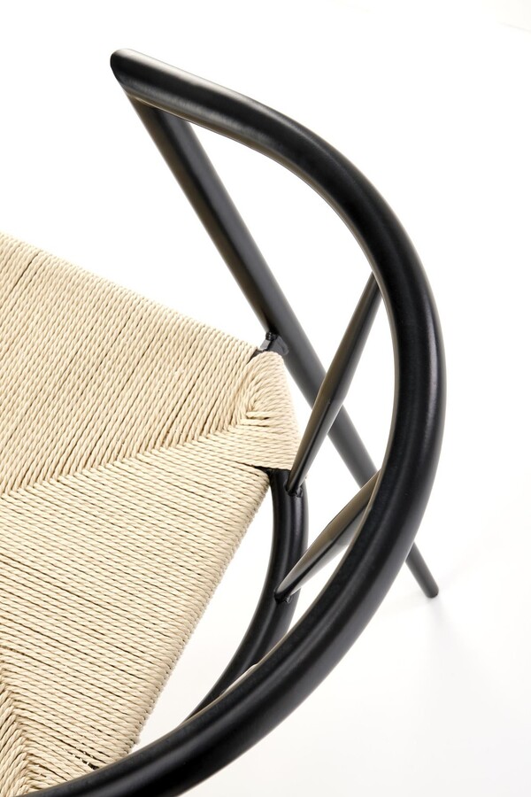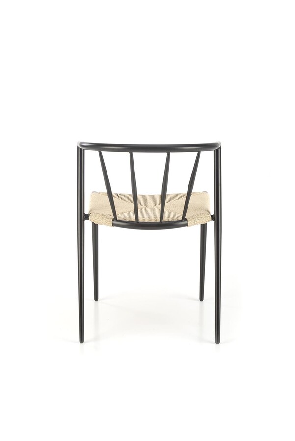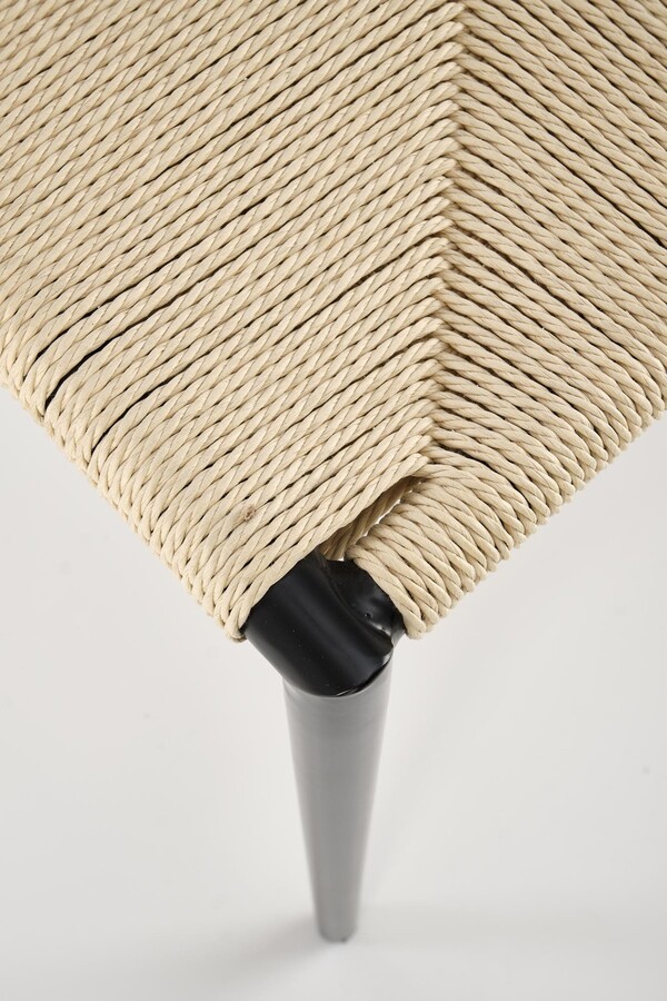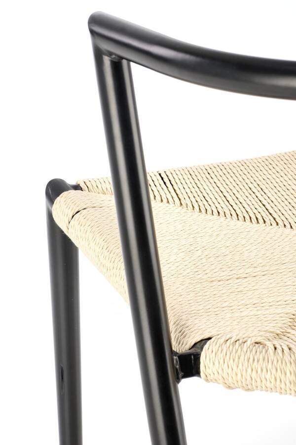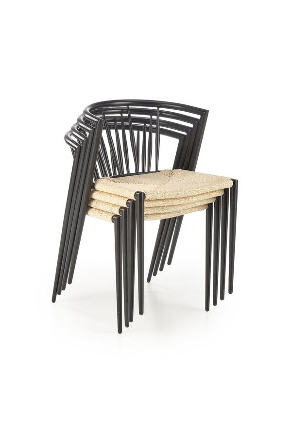 Столът с оригинален дизайн се отличава с определено модерна структура и интересно покритие на седалката. Черната прахово боядисана стоманена рамка придава модерен характер на мебелите. Предните крака на стола са прави , а задните крака са наклонени под ъгъл спрямо седалката и плавно преминават в елемента на облегалката.Това придава на стол необичаен характер и интригуващ вид.Облегалката на стола е изградена от вертикални елементи, свързани в горната част с напречна греда,която придава лекота на мебелите.Много интересна е и седалката на стола,която е изработена от канап и е под формата на оплетка в контрастиращ на рамката бежов цвят.Благодарение на комбинацията от определено модерен дизайн с много традиционен материал и начинът, по който е направена седалката, столът ще бъде перфектен в различни аранжировки: от модерен, през скандинавски и индустриален стил, до класически и рустик, както за жилищни, така и за търговски помещения. Това е стол с оригинален дизайн, който със сигурност ще привлече вниманието и ще добави характер към всеки интериор.