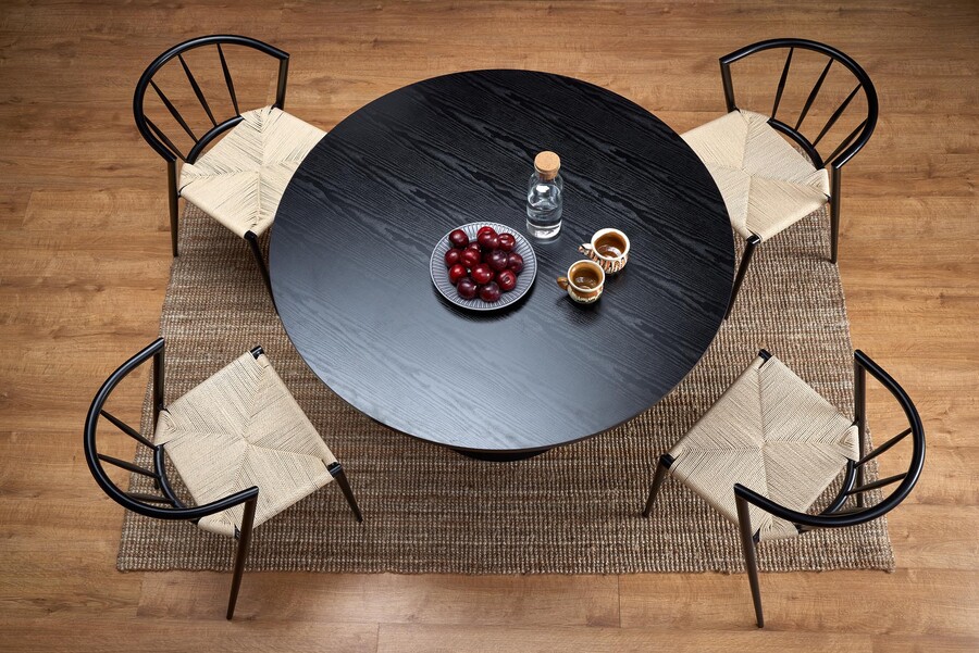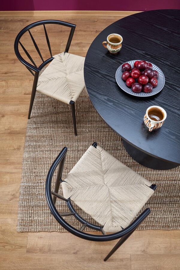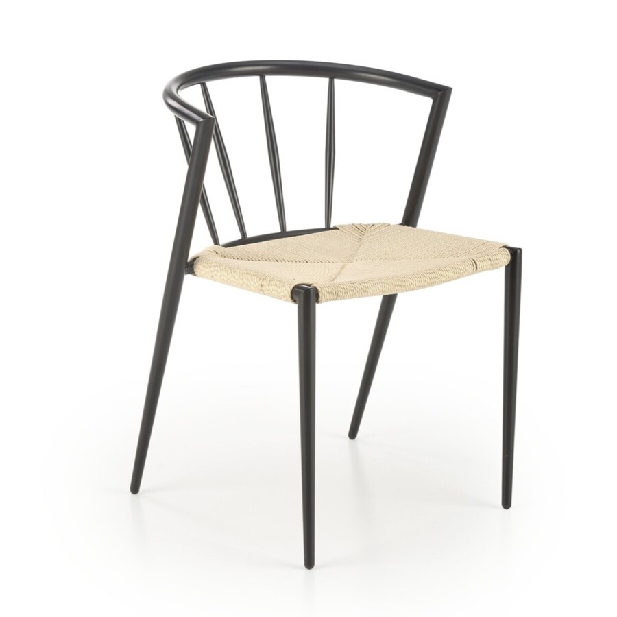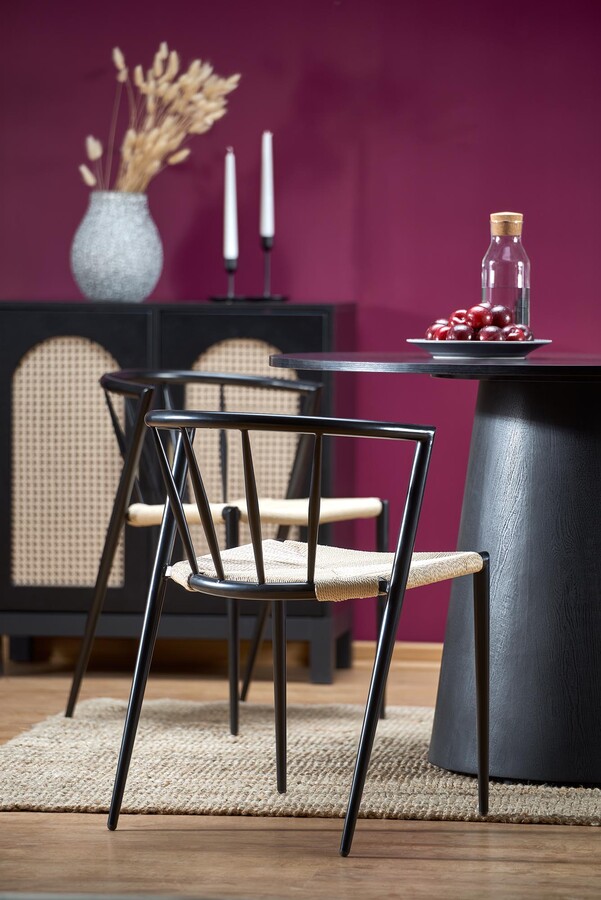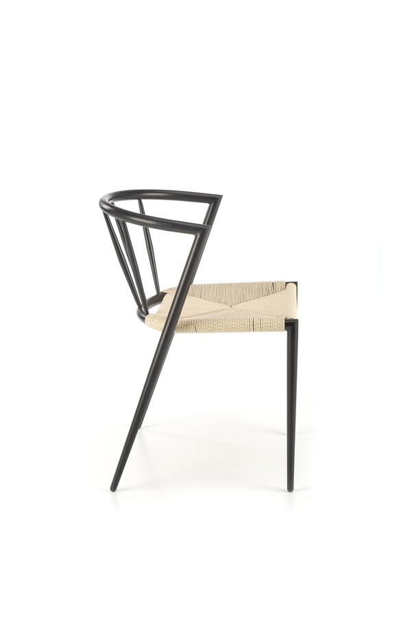 Столът с оригинален дизайн се отличава с определено модерна структура и интересно покритие на седалката. Черната прахово боядисана стоманена рамка придава модерен характер на мебелите. Предните крака на стола са прави , а задните крака са наклонени под ъгъл спрямо седалката и плавно преминават в елемента на облегалката.Това придава на стол необичаен характер и интригуващ вид.Облегалката на стола е изградена от вертикални елементи, свързани в горната част с напречна греда,която придава лекота на мебелите.Много интересна е и седалката на стола,която е изработена от канап и е под формата на оплетка в контрастиращ на рамката бежов цвят.Благодарение на комбинацията от определено модерен дизайн с много традиционен материал и начинът, по който е направена седалката, столът ще бъде перфектен в различни аранжировки: от модерен, през скандинавски и индустриален стил, до класически и рустик, както за жилищни, така и за търговски помещения. Това е стол с оригинален дизайн, който със сигурност ще привлече вниманието и ще добави характер към всеки интериор.