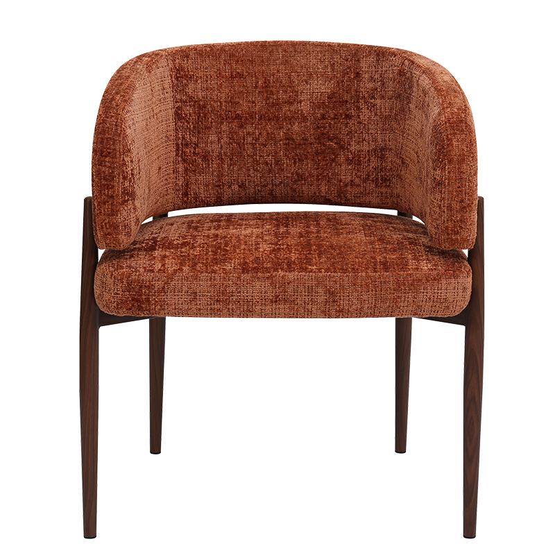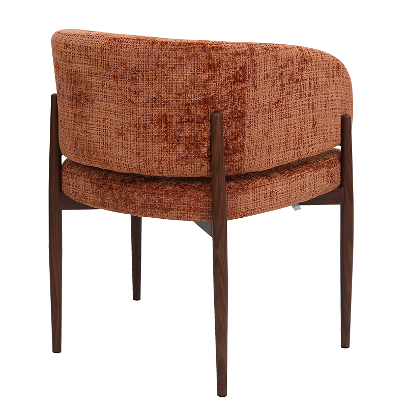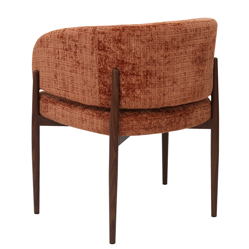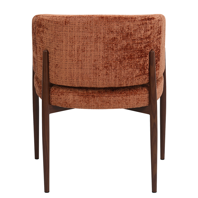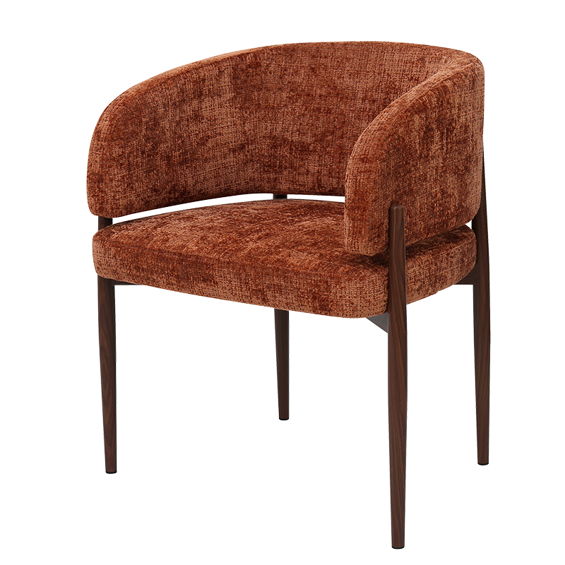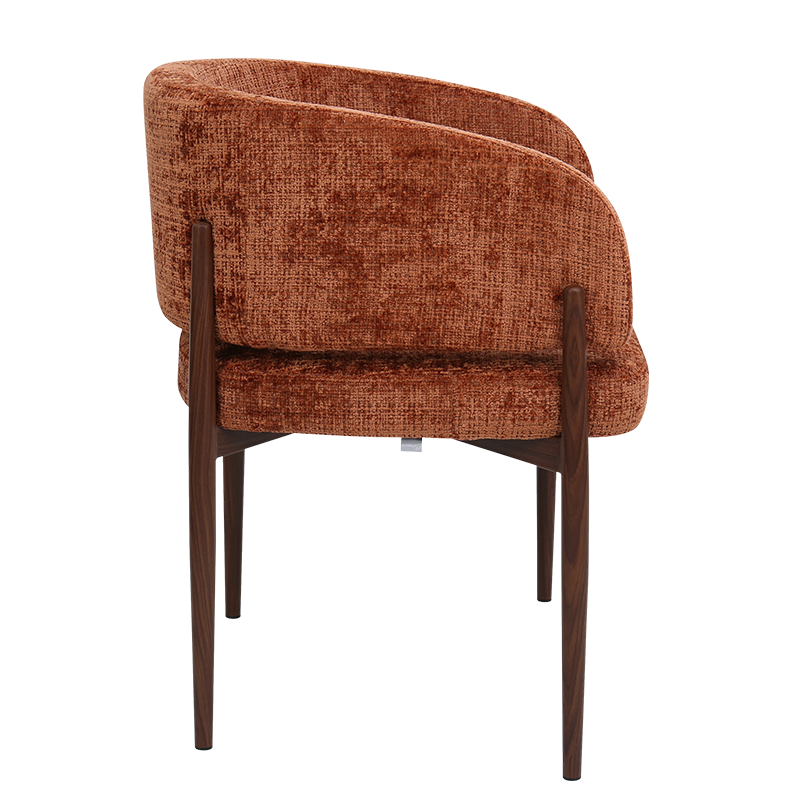 Трапезният стол съчетава модерна визия с комфорт и прецизна изработка. Тапицираната седалка и облегалка с изчистени извивки осигуряват стабилна опора и приятна мекота при сядане. Издължените метални крака с праховобоядисано покритие в дървесен цвят допълват елегантния силует и придават изискан акцент на интериора. Пълна информация за размерите и характеристиките на модела ще намерите в таблицата в таб/поле „Техническа информация“