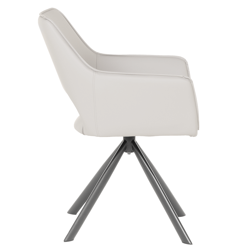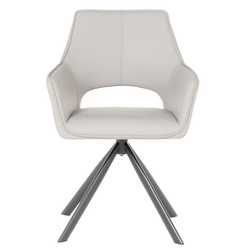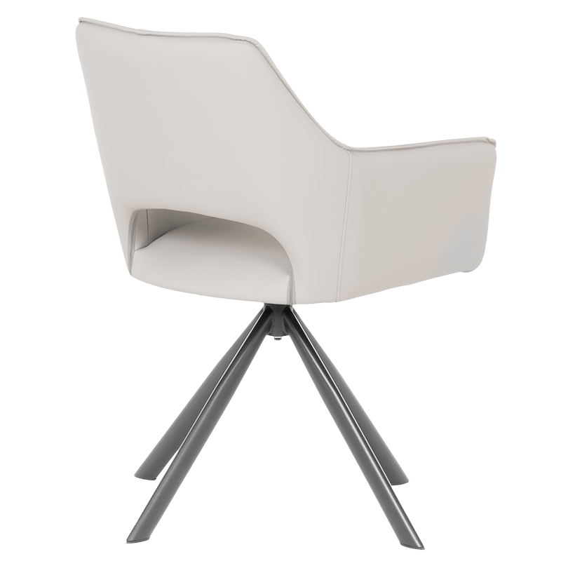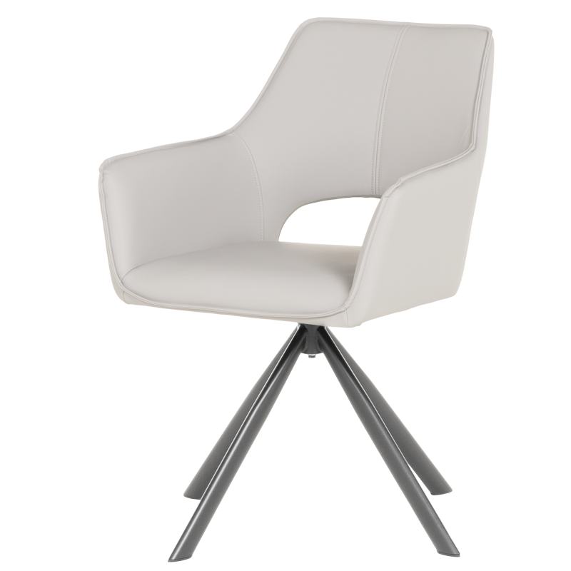 Трапезният стол предлага широка облегалка и седалка, осигуряващи максимален комфорт, а също така разполага с удобни подлакътници от качествена силиконова кожа. Интересно проектираните крака са изработени от праховобоядисан метал, придаващи уникален стил на изделието. Функцията за въртене на 360° допълва изживяването, предоставяйки допълнителна свобода на движение и комфорт. Подробната информация за размерите и характеристиките е налична в секцията с технически данни.
