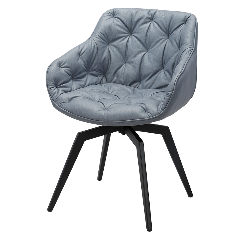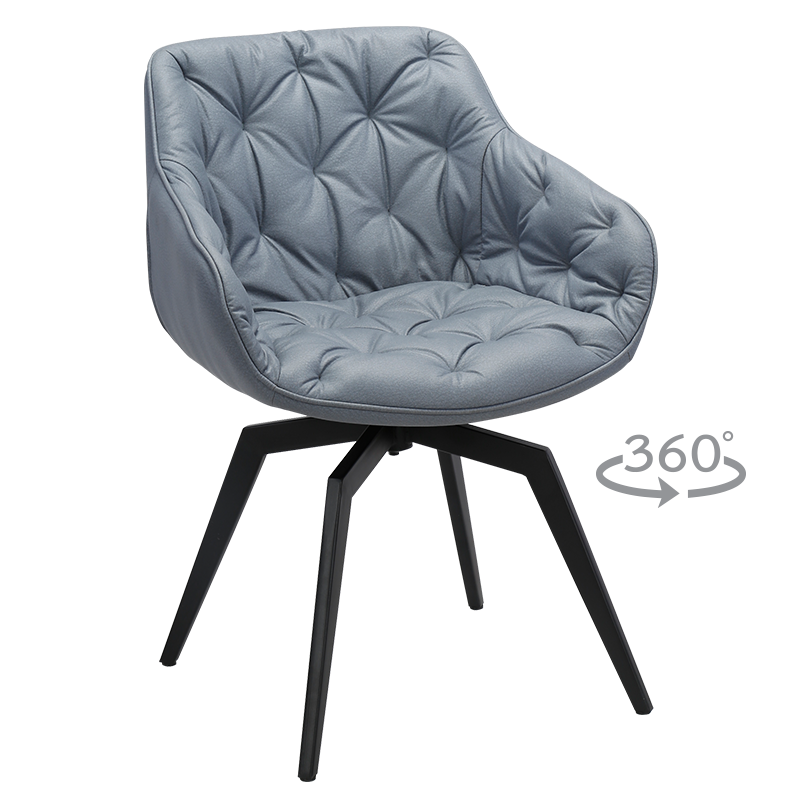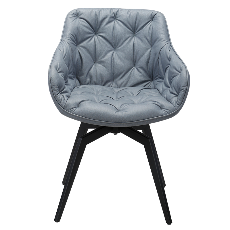 Столът е проектиран с ергономична форма, която осигурява оптимална подкрепа на тялото, като същевременно позволява свобода на движение. Здравата основа е изработена от метал с черно покритие, което гарантира стабилност и устойчивост. Четирите крака са разположени под ъгъл, което придава модерна визия и допълнителна стабилност.